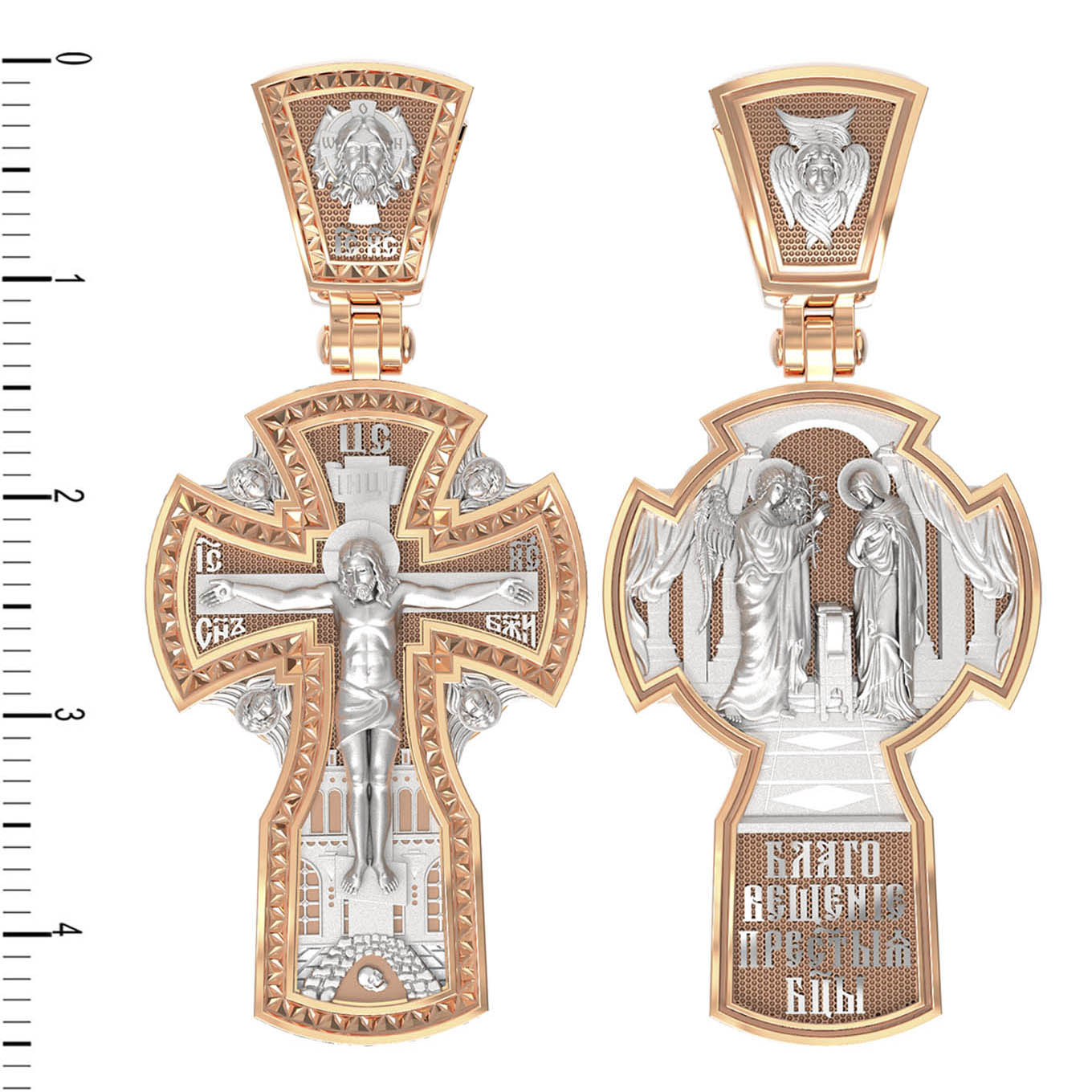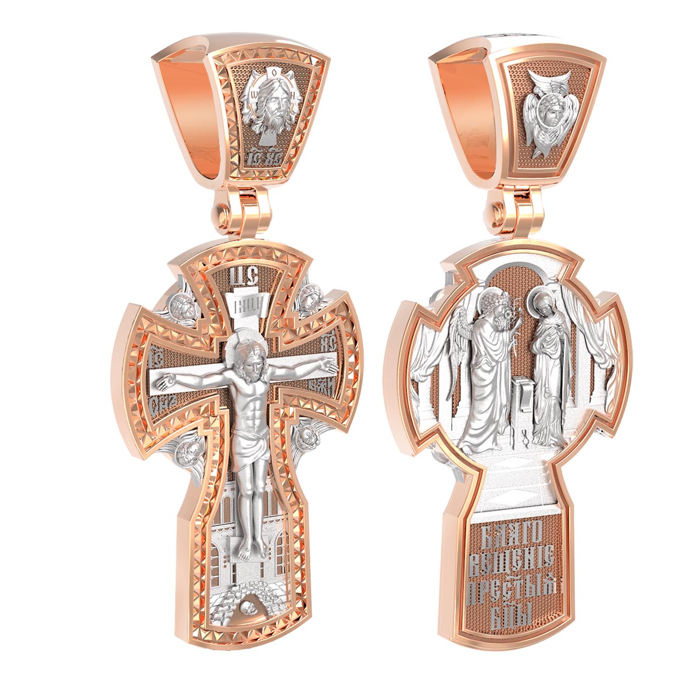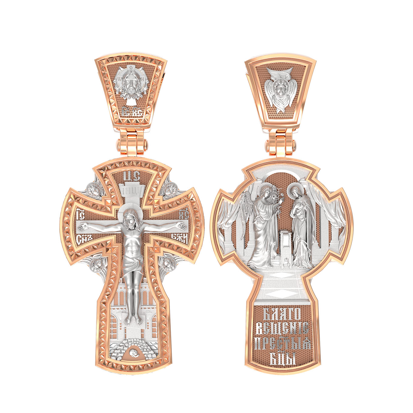 На оборотной стороне креста изображена икона «Благовещение Пресвятой Богородицы». Как нам повествует Священное Писание, Архангел Гавриил послан был от Бога в город Назарет к Пресвятой Деве Марии с радостной вестью, что Господь избрал Ее быть Матерью Спасителя мира. Ангел сказал: «Радуйся благодатная! Господь с Тобою! Благословенна Ты между женами». Мария cмутилась от слов Ангела и думала: что значит это приветствие? Ангел же продолжал говорить Ей: «не бойся, Мария, ибо Ты обрела благодать у Бога. И вот, Ты родишь Сына и наречешь имя Ему Иисус. Он будет велик, и назовется сыном Всевышнего, и Царству Его не будет конца…» На кулонном кольце изображен Ангел Серафим.