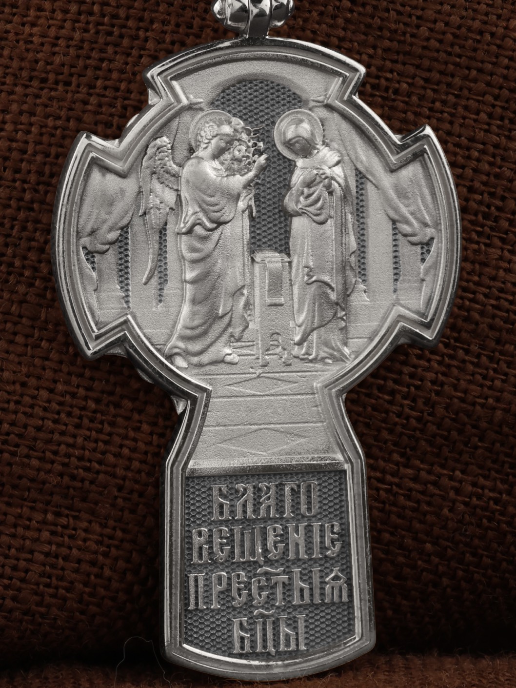 На оборотной стороне креста изображена икона «Благовещение Пресвятой Богородицы». Как нам повествует Священное Писание, Архангел Гавриил послан был от Бога в город Назарет к Пресвятой Деве Марии с радостной вестью, что Господь избрал Ее быть Матерью Спасителя мира. Ангел сказал: «Радуйся благодатная! Господь с Тобою! Благословенна Ты между женами». Мария cмутилась от слов Ангела и думала: что значит это приветствие? Ангел же продолжал говорить Ей: «не бойся, Мария, ибо Ты обрела благодать у Бога. И вот, Ты родишь Сына и наречешь имя Ему Иисус. Он будет велик, и назовется сыном Всевышнего, и Царству Его не будет конца…» На кулонном кольце изображен Ангел Серафим.