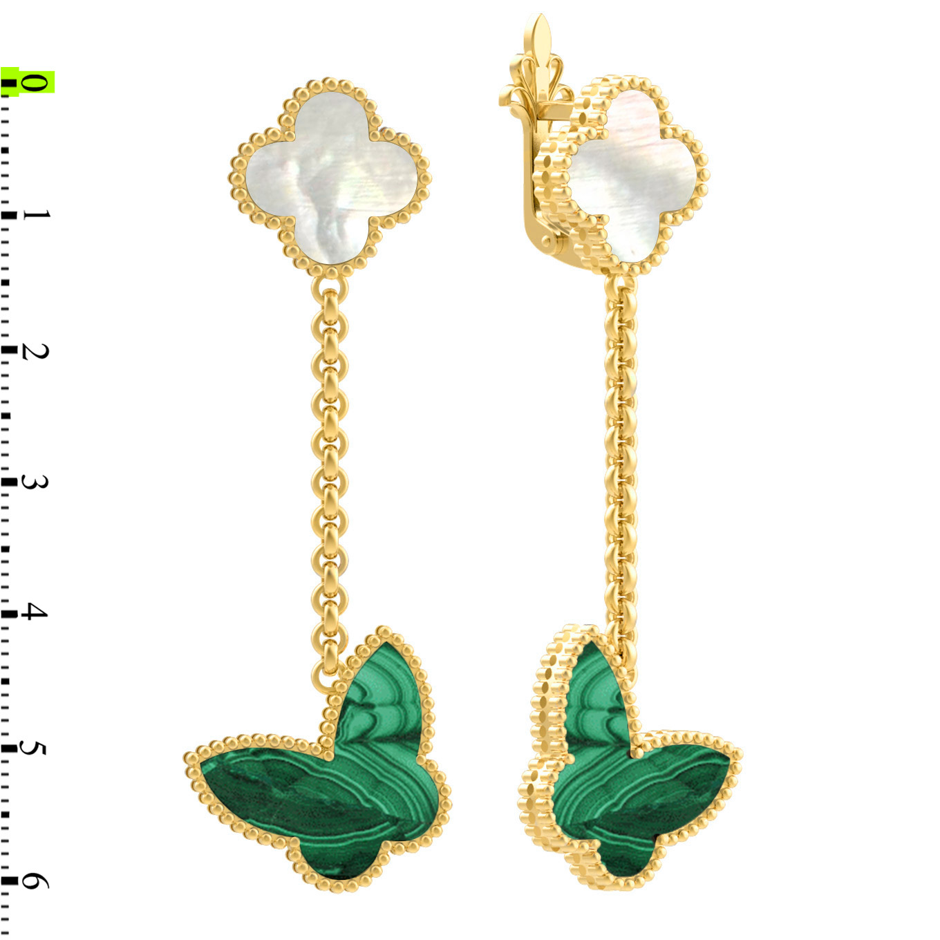 В центре композиции — сочетание контрастных вставок: завораживающего зеленого малахита и нежного перламутра. Две вставки, искусно ограненные, создают выразительный дуэт, который привлекает внимание к лицу и подчеркивает индивидуальность владелицы. Уникальный дизайн, где перламутр дополняет верхнюю часть, а малахит образует форму крыльев бабочки на подвижной цепочке, делает эти серьги настоящим произведением ювелирного искусства.