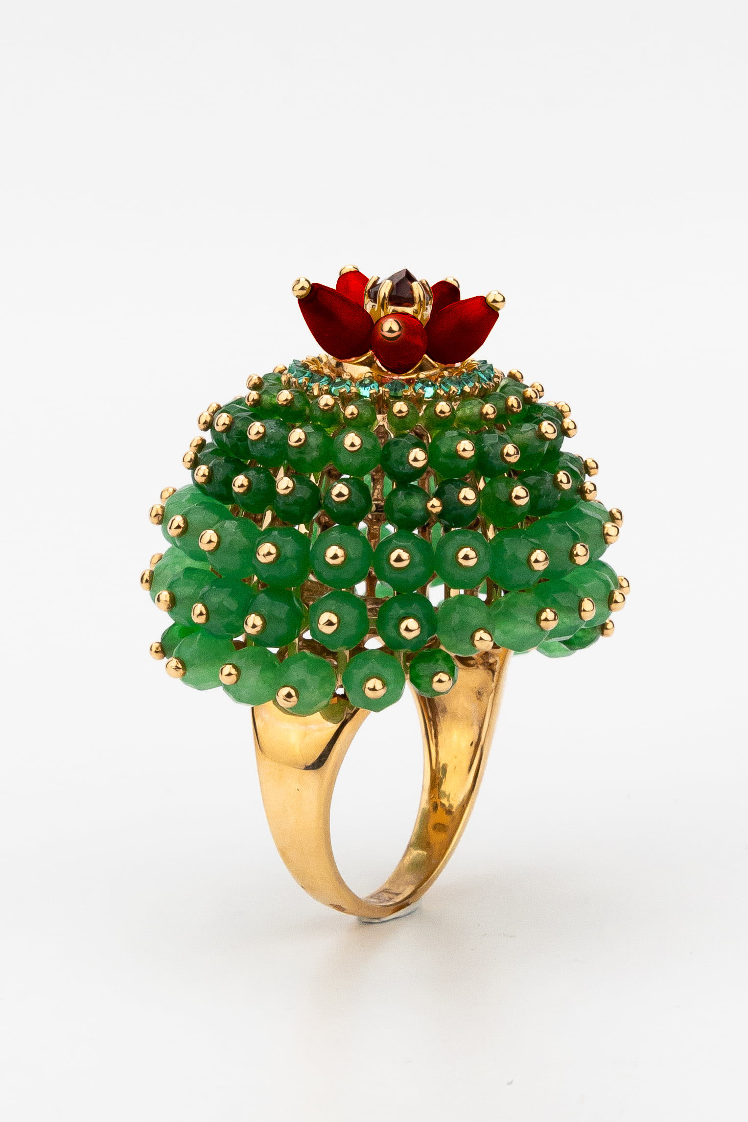 Великолепное кольцо украшают 138 вставок, среди которых гармонично сочетаются гранат, изумруд, коралл и хризопраз. Разнообразие форм вставок — круглые элементы и бусины — создают неповторимую фактуру, напоминающую природные очертания экзотического растения. Контраст бирюзовых, зеленых и красных оттенков придает украшению особую выразительность и глубину. Это кольцо является универсальным аксессуаром, который одинаково эффектно смотрится как на женской, так и на мужской руке, становясь ключевым акцентом образа.