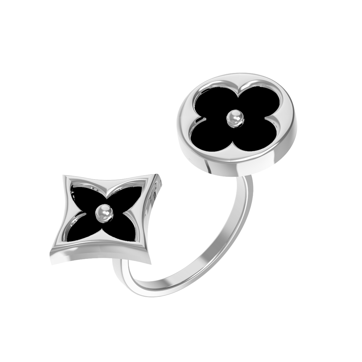 Кольцо из белого золота 585 пробы — это изысканное ювелирное украшение, которое станет акцентным элементом вашего образа. Дизайн изделия, вдохновленный мотивами клевера, сочетает в себе лаконичность благородного металла и глубокий контраст вставок. В данной модели использованы две вставки из черного оникса, которые эффектно выделяются на фоне холодного блеска белого золота.