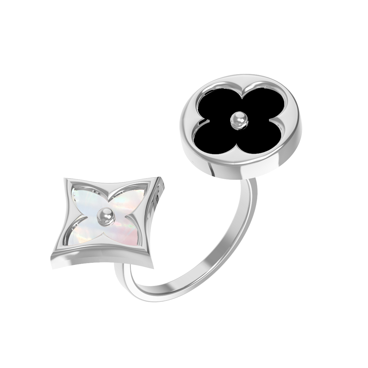 Основа кольца изготовлена из качественного белого золота 585 пробы, что обеспечивает долговечность и благородный блеск. В центре внимания — контрастное сочетание вставок: глубокий черный оникс круглой формы и нежный, переливающийся перламутр в форме ромба. Гармония между строгостью камней и чистотой металла создает выразительный визуальный эффект.