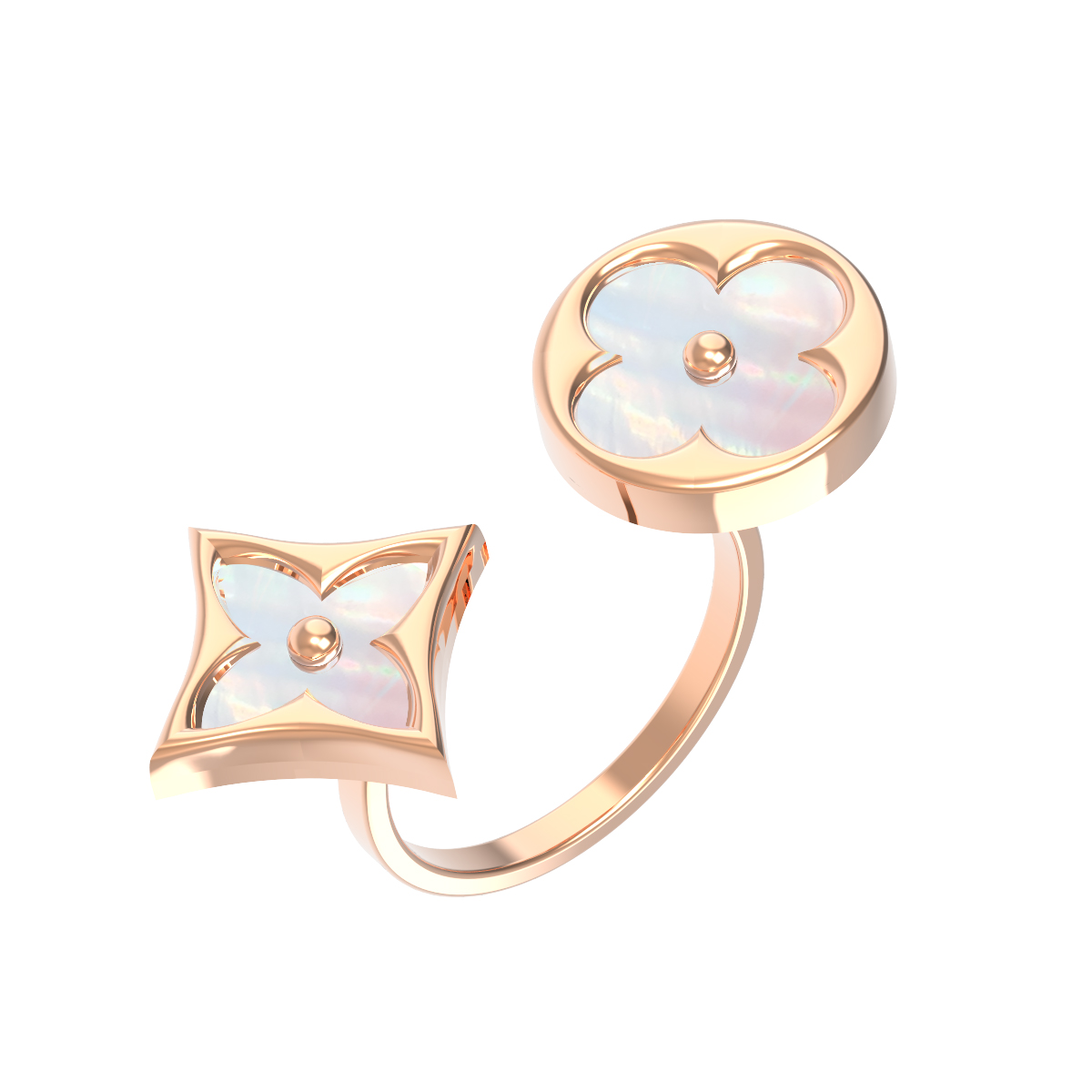 Дизайн изделия построен на оригинальном сочетании форм: одна часть украшения выполнена в виде клевера с круглой вставкой, другая — в форме ромба. Такая геометрия делает кольцо акцентным аксессуаром, привлекающим внимание к рукам. Модель универсальна и подходит как для женщин, так и для мужчин, предпочитающих лаконичные ювелирные решения.