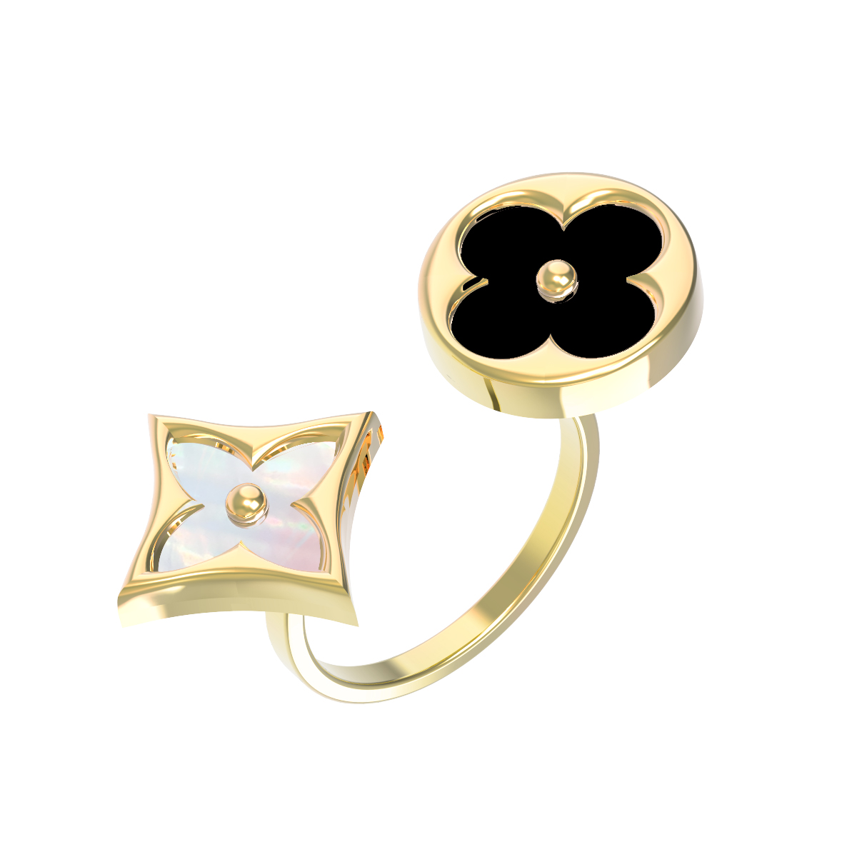 Элегантное кольцо из лимонного золота 585 пробы — яркий акцент, который подчеркнет ваш безупречный вкус и статус. Это изысканное украшение из De Luxe — Амальфи сочетает в себе благородство драгоценного металла и контрастность природных вставок. Дизайн изделия выполнен в форме изящного клевера, что придает аксессуару нотки романтики и символизм удачи. В оформлении использованы два типа вставок: глубокий черный оникс круглой формы и нежный, переливающийся перламутр в форме ромба, создающие гармоничный и выразительный дуэт.