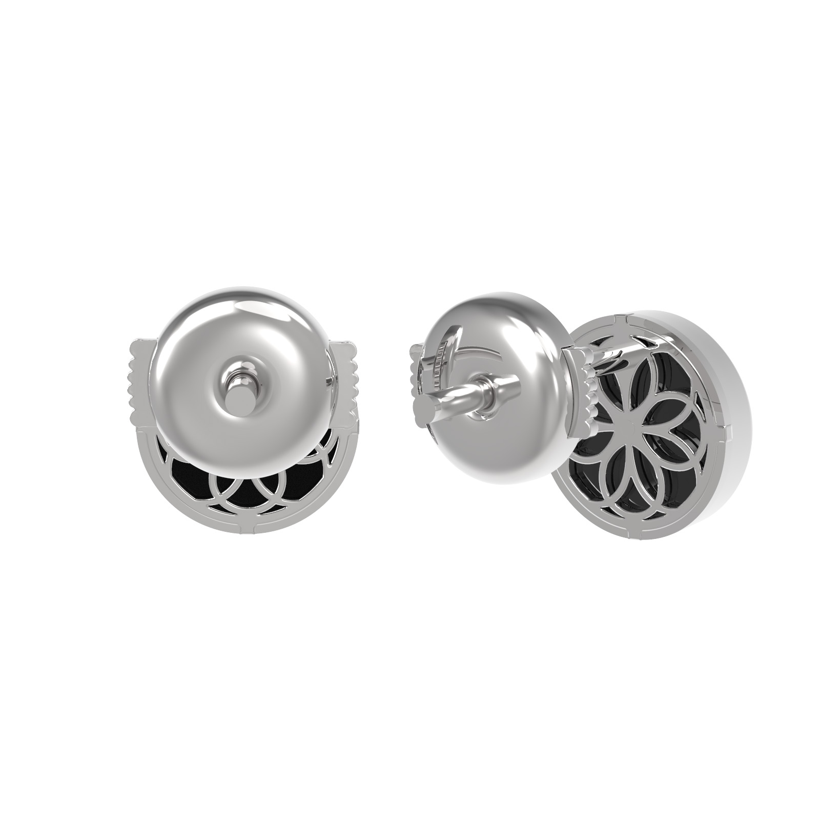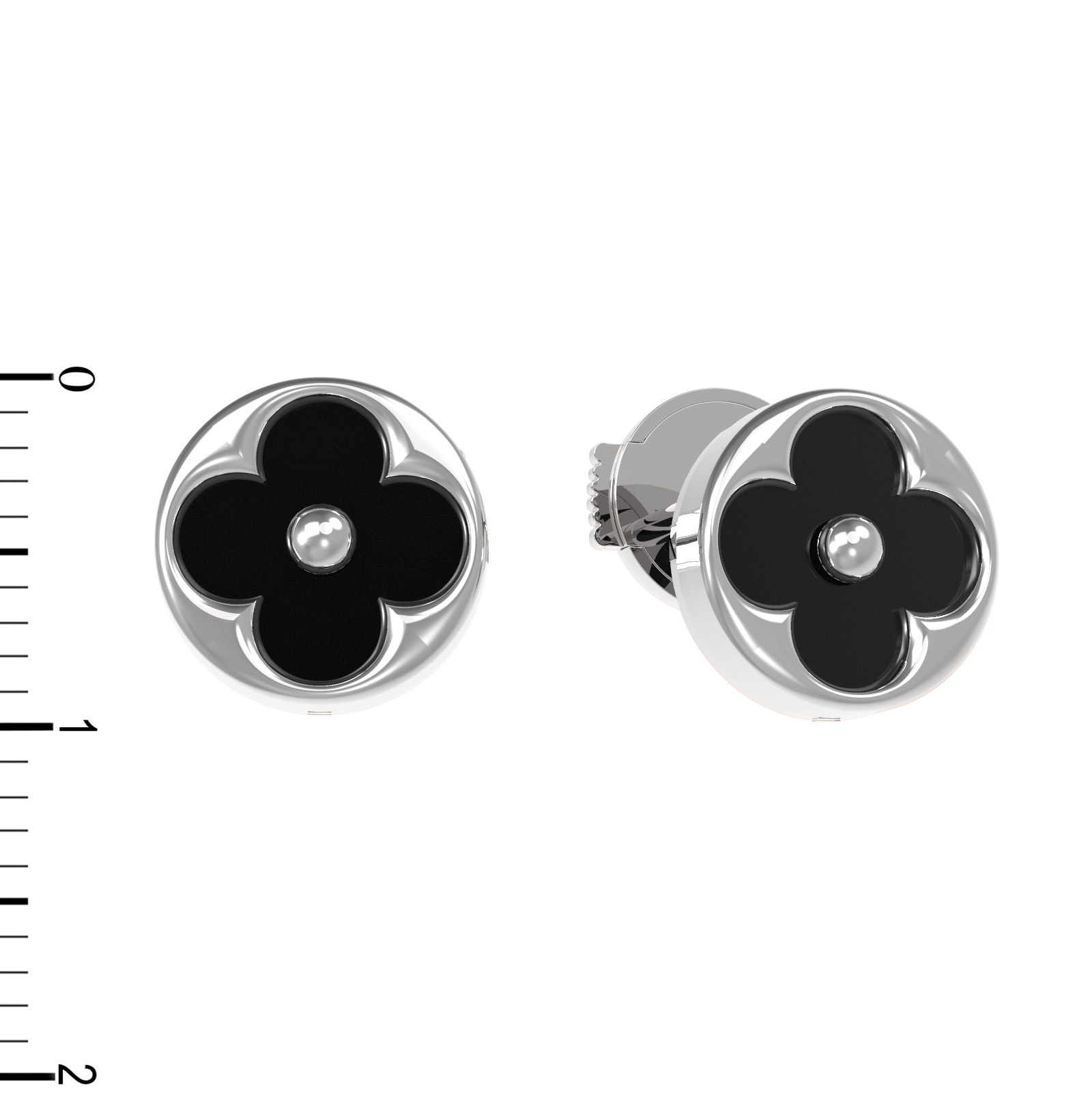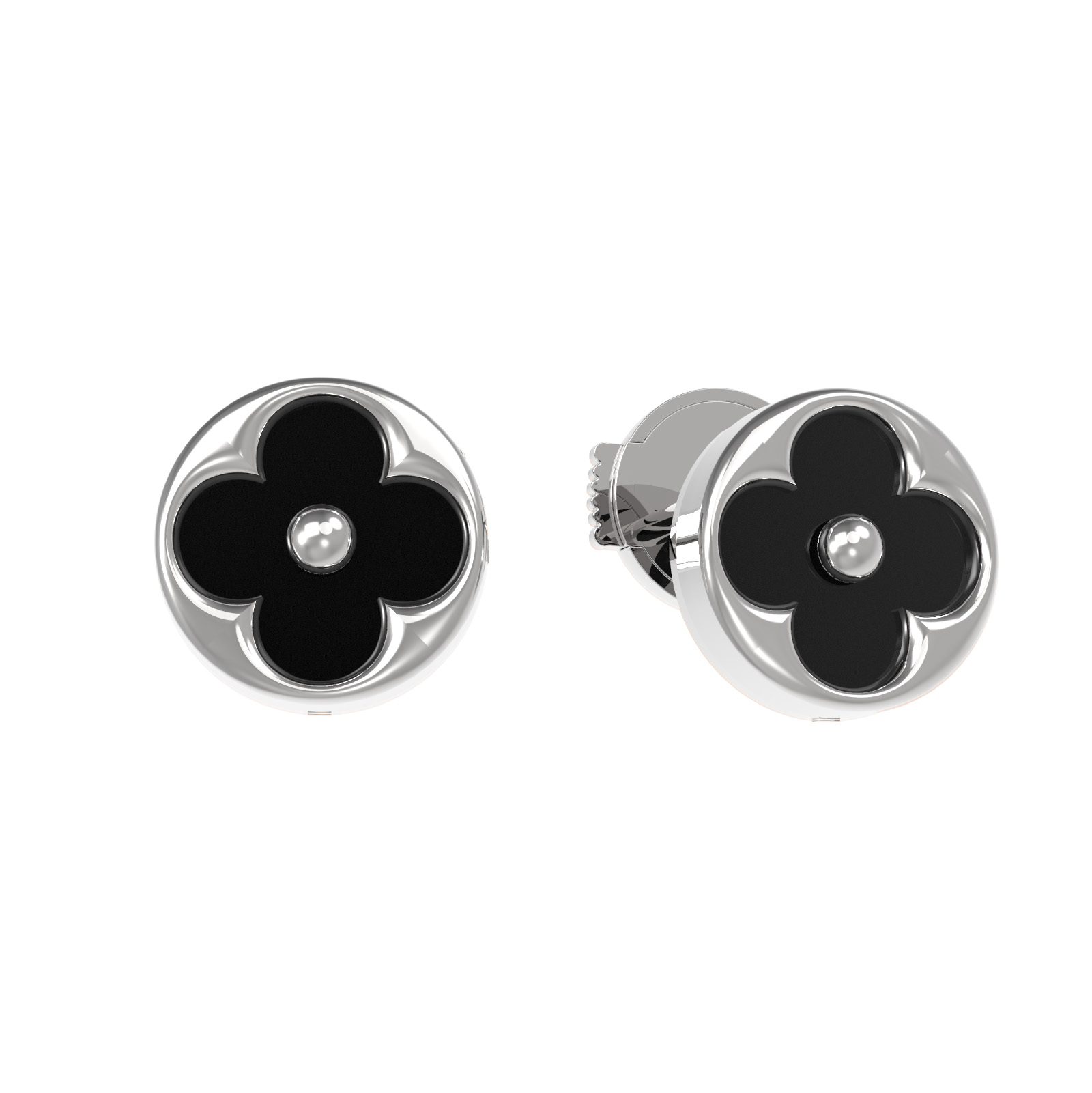 В центре композиции расположены 2 вставки из оникса круглой формы, обладающие насыщенным черным цветом. Контрастное сочетание белого золота и темного камня создает выразительный акцент, который притягивает взгляд и подчеркивает безупречный вкус владельца. Ювелирное изделие отличается высоким качеством исполнения и продуманной до мелочей формой.