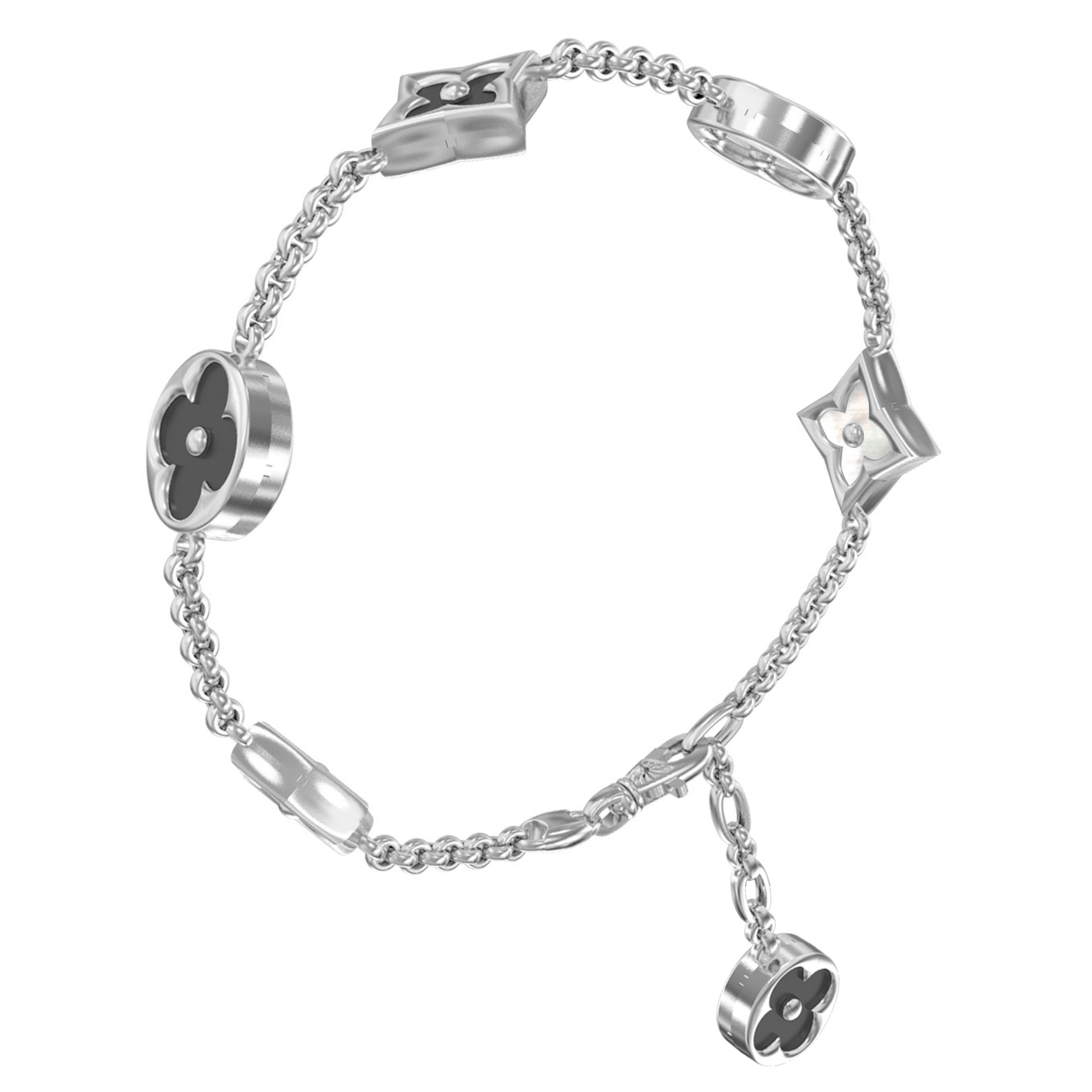 Композиция включает в себя 6 вставок, чередующихся в строгом порядке: глубокий черный оникс и нежный переливчатый перламутр. Контраст черного и перламутрового оттенков подчеркивается геометрией форм вставок — круглых и ромбовидных элементов, закрепленных на изящной цепочке. Белое золото служит идеальной оправой, подчеркивая чистоту и глубину натуральных камней.