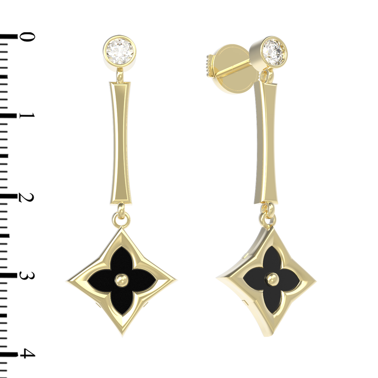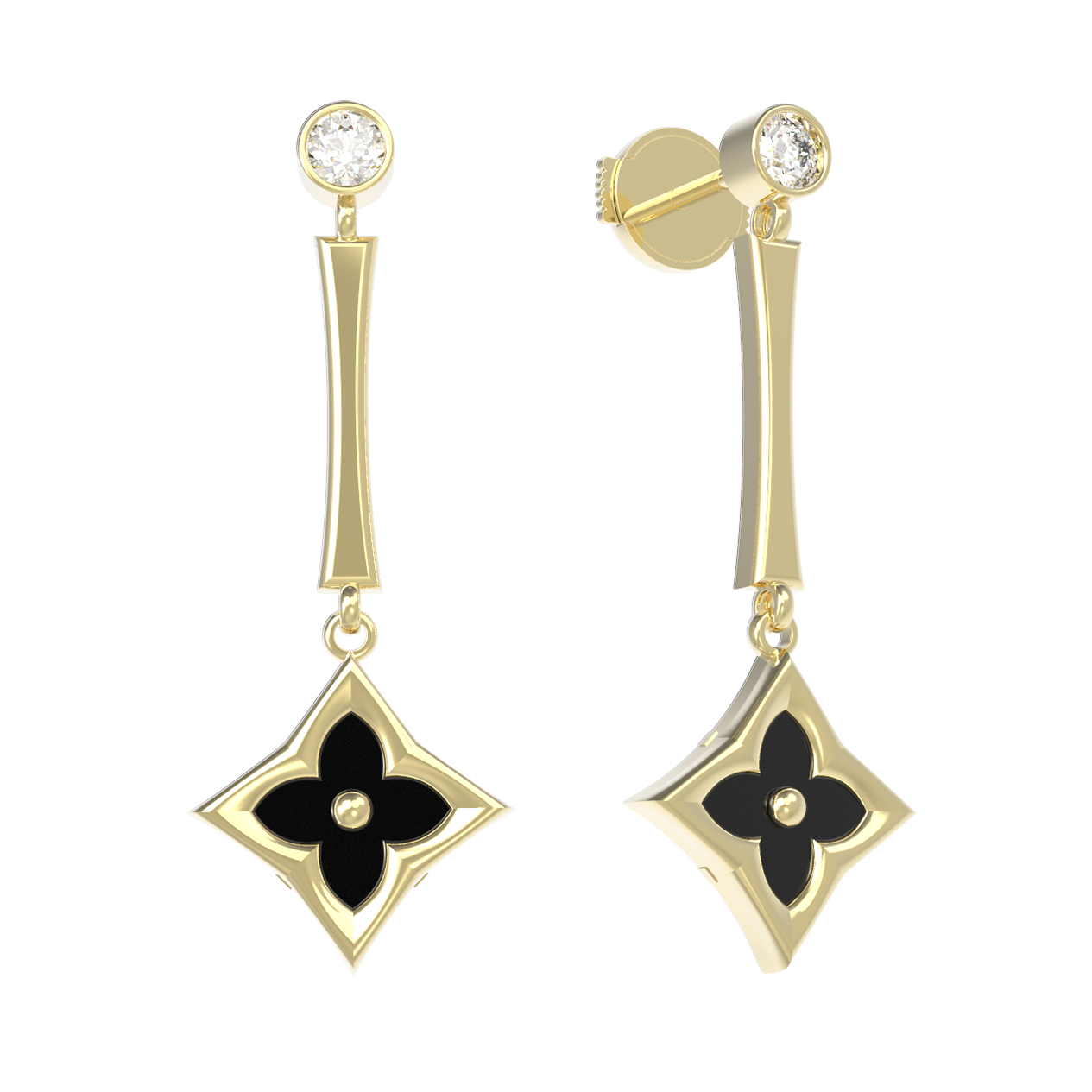 Основой дизайна выступает изысканная форма клевер, которая давно стала символом утонченности в ювелирном искусстве. Композиция дополнена контрастным сочетанием материалов: глубокий черный оникс в форме ромба великолепно гармонирует с сияющим белым фианитом круглой огранки. Всего в изделии использованы 4 вставки, которые создают эффектный визуальный баланс.