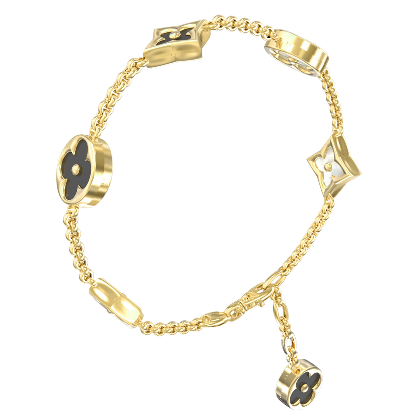 Особое очарование браслету придают шесть вставок, сочетающих в себе глубину черного оникса и нежное сияние перламутра. Формы вставок — круг и ромб — гармонично переплетаются в единой композиции, создавая завораживающий контраст цвета и фактур. Черный оникс привносит нотки строгости и загадочности, в то время как перламутр добавляет мягкого, жемчужного блеска. Это универсальное украшение одинаково эффектно смотрится как на женском, так и на мужском запястье, подчеркивая индивидуальность и безупречный вкус своего обладателя.