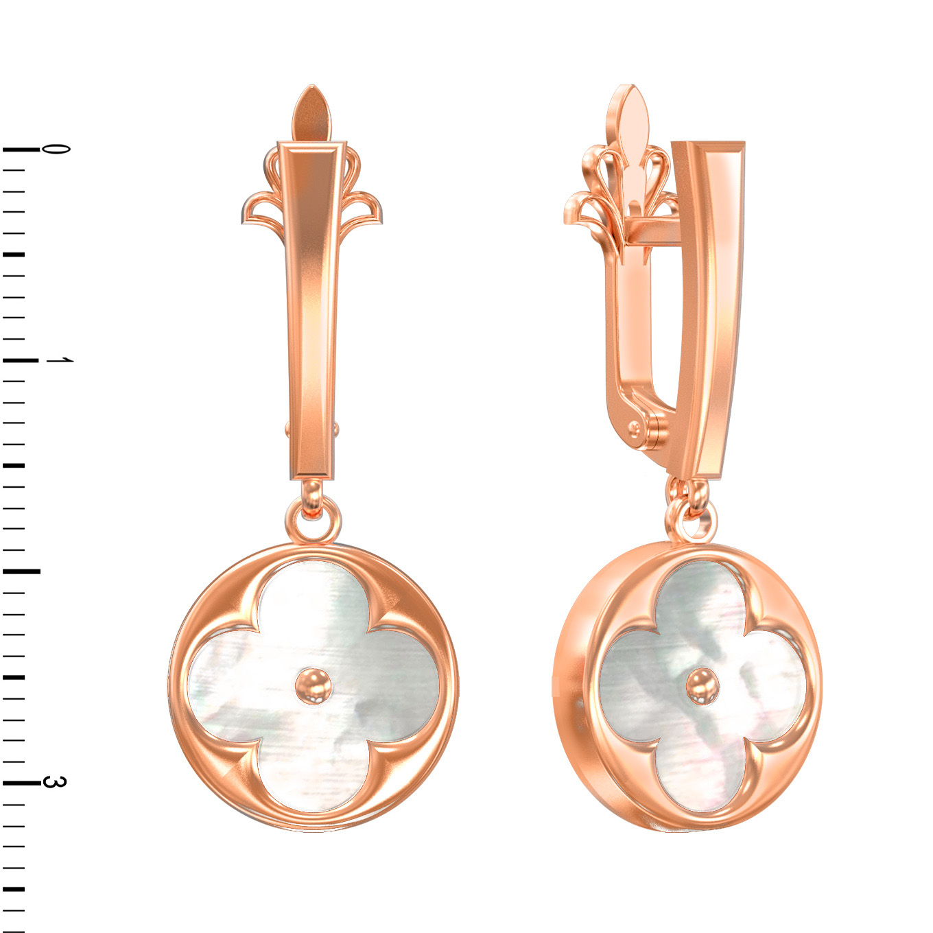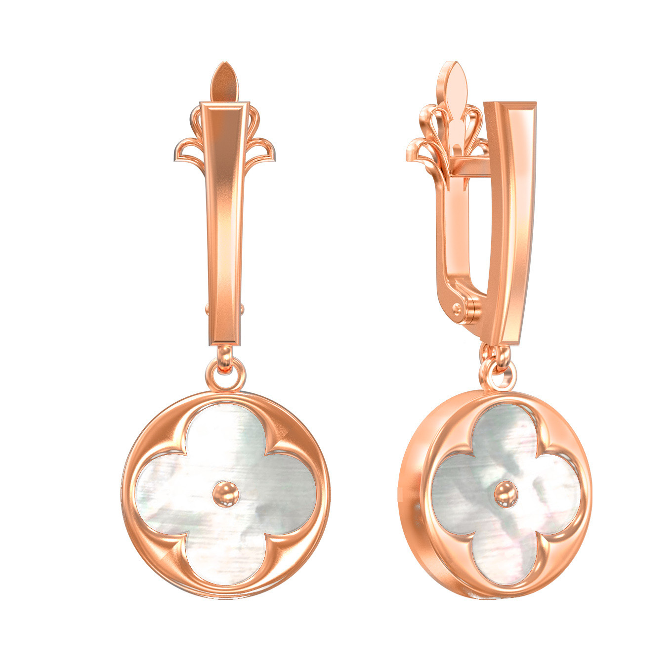 Серьги из красного золота 585 пробы из коллекции De Luxe — Амальфи представляют собой воплощение утонченного стиля и природной красоты. Центральным элементом украшения выступает изысканная вставка из перламутра круглой формы, выполненная в узнаваемом дизайне «клевер». Нежное сияние перламутра идеально сочетается с теплым оттенком красного металла, подчеркивая статусность и безупречный вкус владельца.