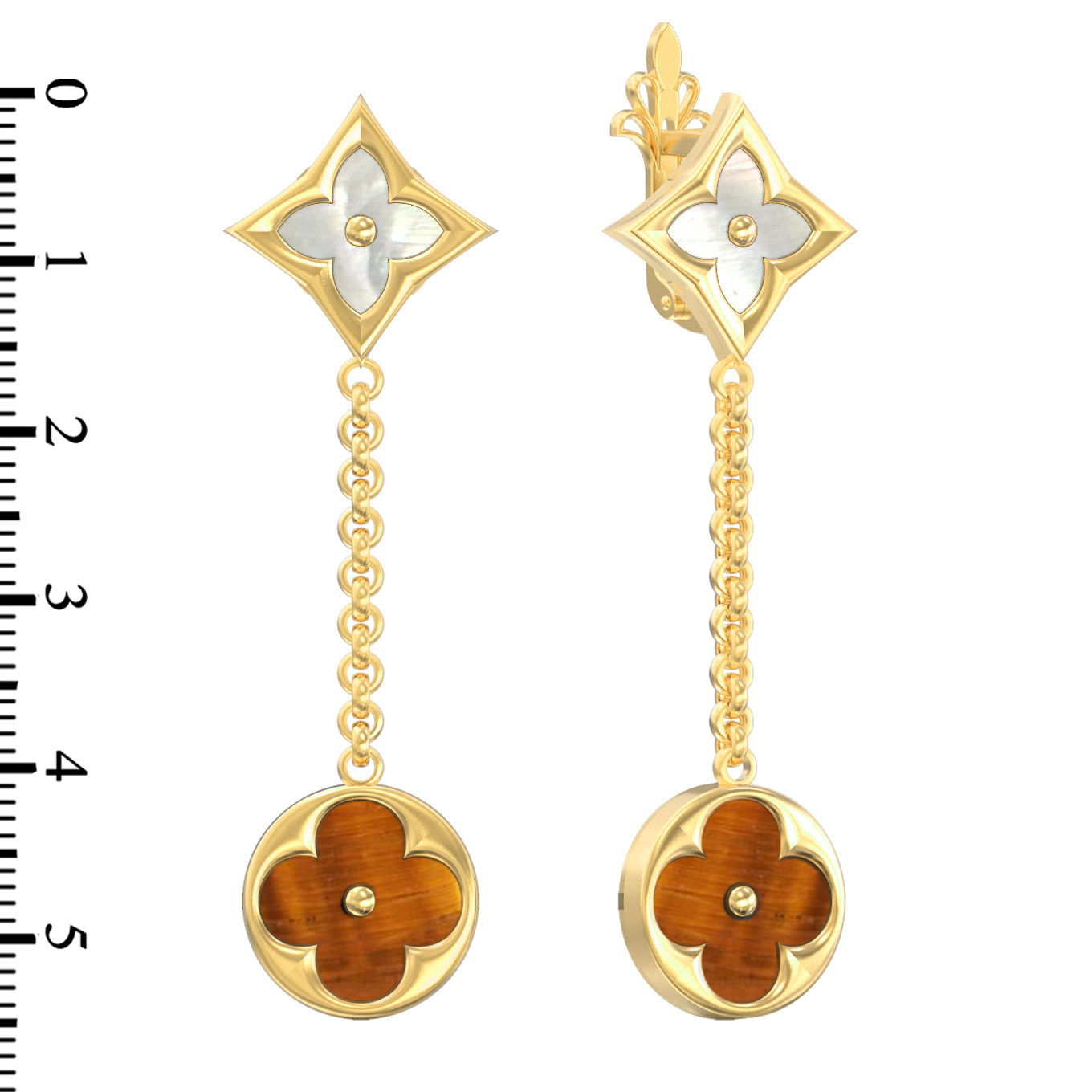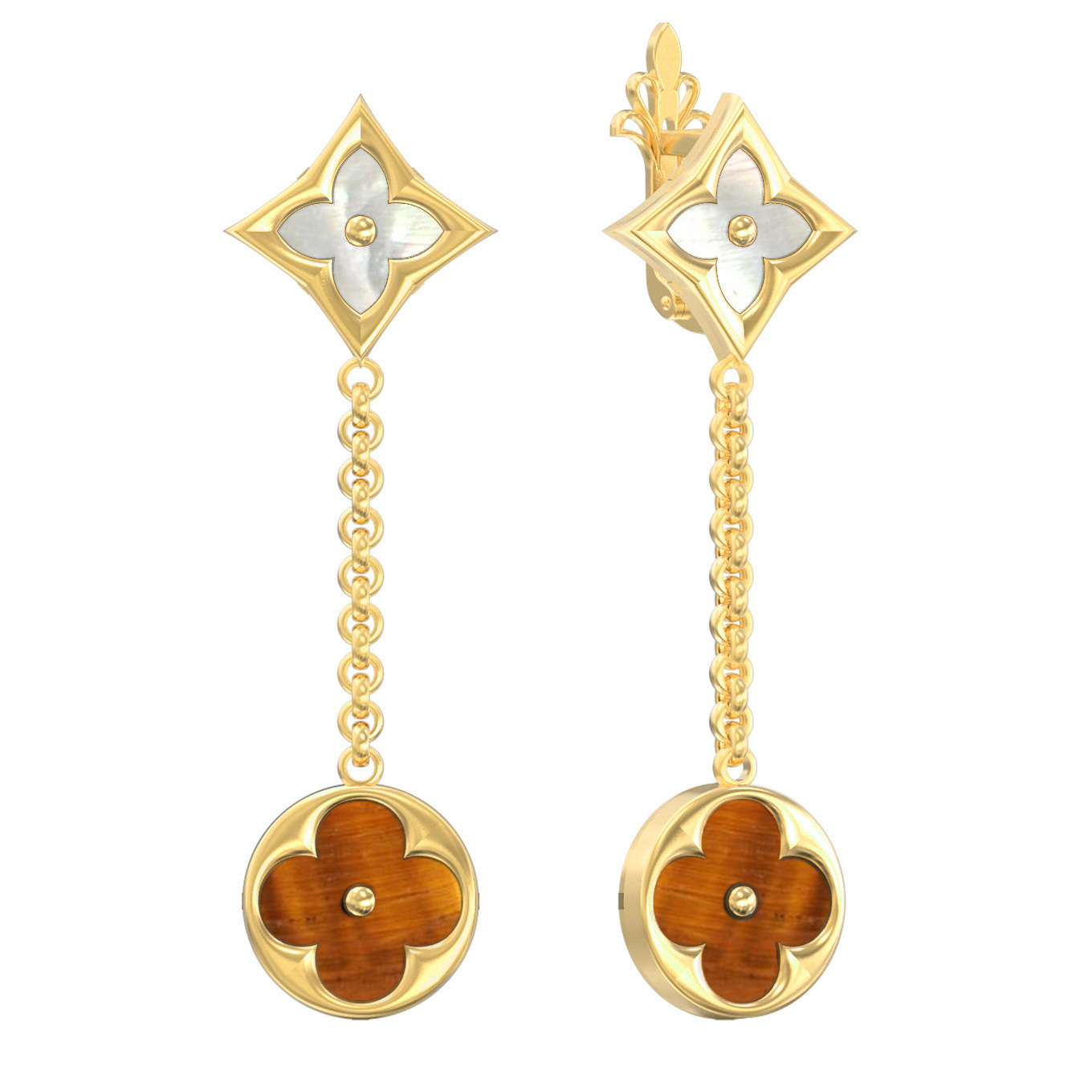 В центре композиции — эффектная игра контрастов. Верхняя часть изделия имеет форму ромба, декорированного перламутром, чье нежное сияние притягивает взгляд. Нижняя часть выполнена в форме круга, внутри которого расположен оранжевый тигровый глаз, добавляющий глубины и теплого природного оттенка. Общее количество вставок — 2. Ювелиры мастерски объединили эти элементы подвижной цепочкой, благодаря чему серьги красиво покачиваются при движении, оживляя образ.