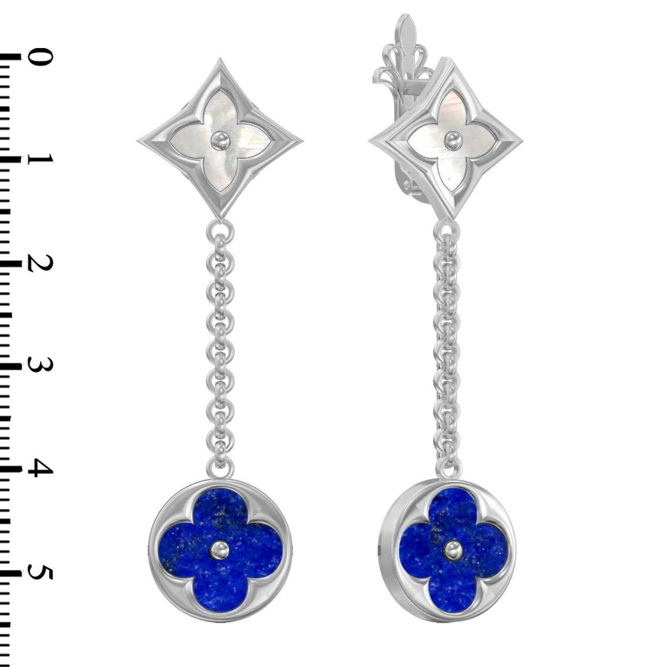 Дизайн серег основан на культовом геометрическом мотиве — клевер, который выглядит современно и выразительно. В центре внимания — сочетание контрастных материалов: насыщенного синего лазурита и нежного переливающегося перламутра. Формы вставок — круг и ромб — создают динамичную композицию, подчеркнутую изящной цепочкой. Всего в изделии использованы 2 вставки, искусно ограненные для максимального блеска.