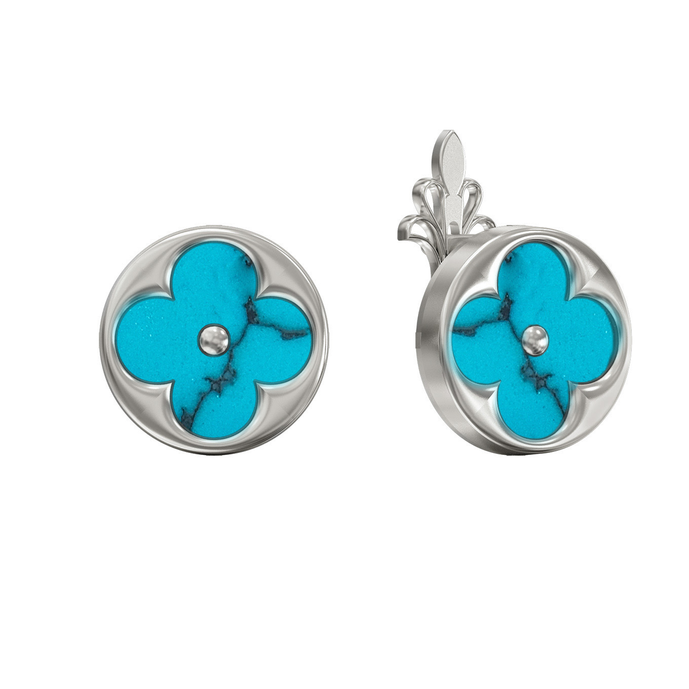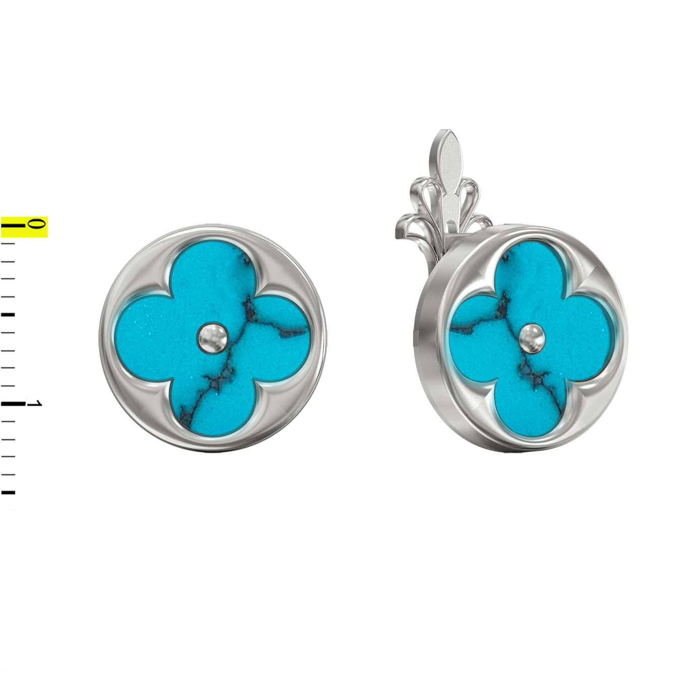 В центре композиции расположены две вставки из натуральной бирюзы бирюзового цвета. Камни круглой формы мастерски вписаны в декоративный элемент, создавая эффектный контраст с белым золотом. Лаконичная и продуманная конструкция делает эти серьги универсальным аксессуаром, который одинаково гармонично дополнит как женский, так и мужской образ. Изделие отличается высоким качеством исполнения и вниманием к деталям.