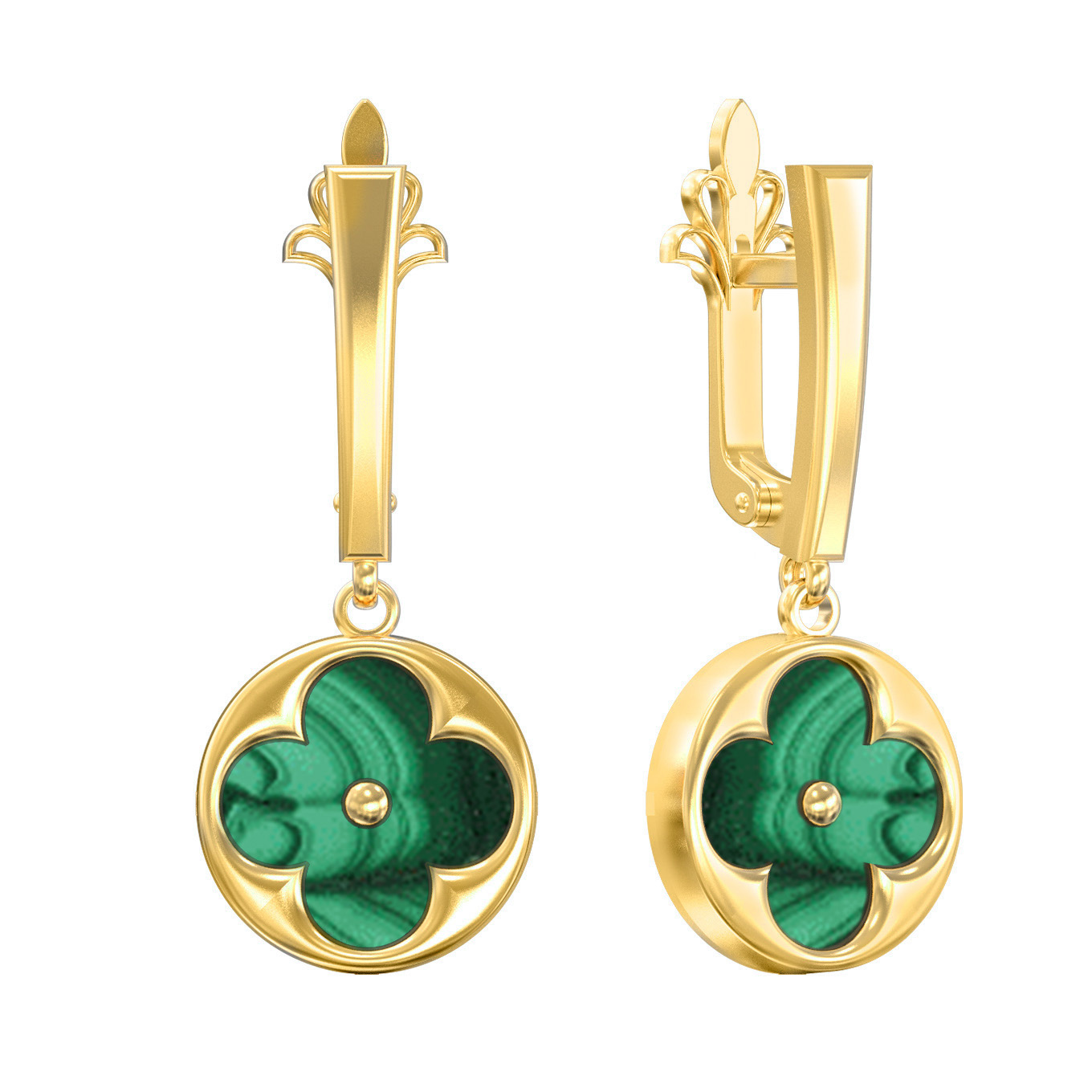 Серьги из лимонного золота 585 пробы из коллекции De Luxe — Амальфи представляют собой гармоничное сочетание классического благородства и современной ювелирной эстетики. В центре внимания — глубокий зеленый цвет натурального малахита. Две вставки круглой формы мастерски интегрированы в дизайн клевер, создавая узнаваемый и притягательный образ, который никогда не теряет своей актуальности.