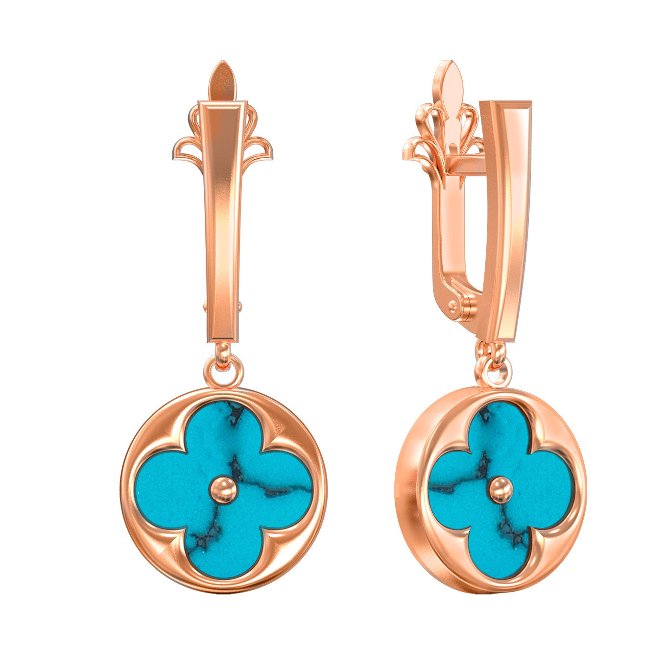 В дизайне использованы 2 круглые вставки из бирюзы, чей насыщенный небесно-голубой оттенок выигрышно контрастирует с теплым блеском красного золота. Такая цветовая палитра делает изделие универсальным дополнением как для повседневного, так и для вечернего образа. Серьги обладают продуманной геометрией, которая комфортно располагается на мочке уха, обеспечивая надежную фиксацию и удобство при носке.