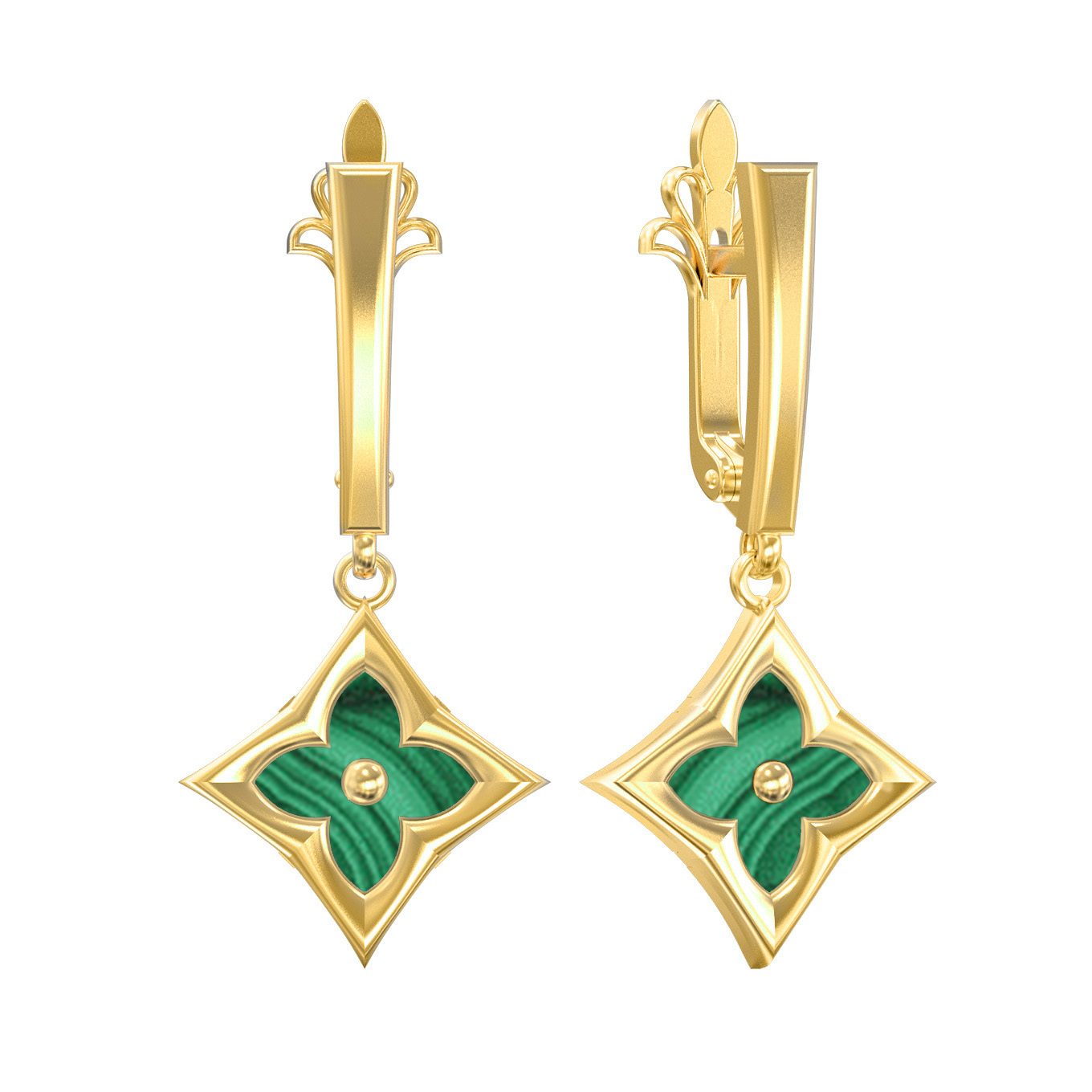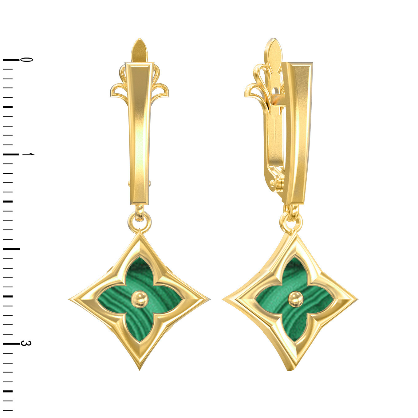 Серьги из лимонного золота 585 пробы из коллекции De Luxe — Амальфи представляют собой гармоничное сочетание благородного металла и природной красоты минералов. Это изысканное украшение привлекает внимание своим утонченным дизайном в форме клевера, который придает образу нотки аристократизма и природного шарма. Центральным элементом композиции является яркий малахит глубокого зелёного цвета, ограненный в форме ромба. Две вставки из малахита идеально сочетаются с теплым лимонным блеском золота, создавая выразительный акцент для вашего повседневного или вечернего образа.