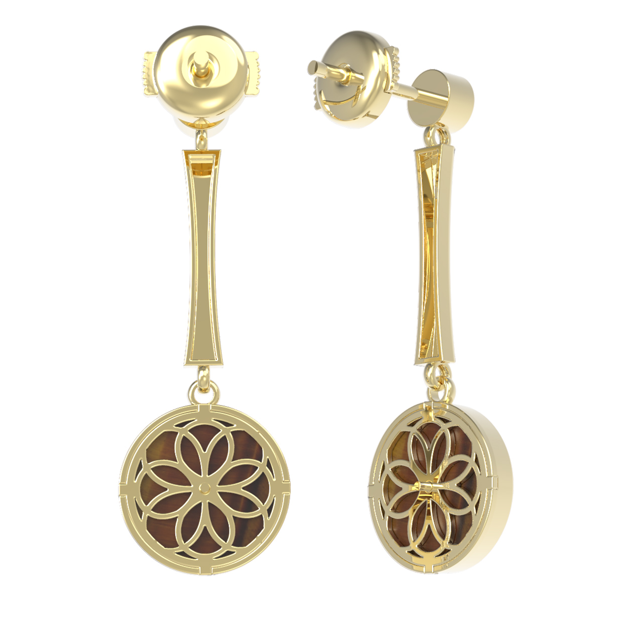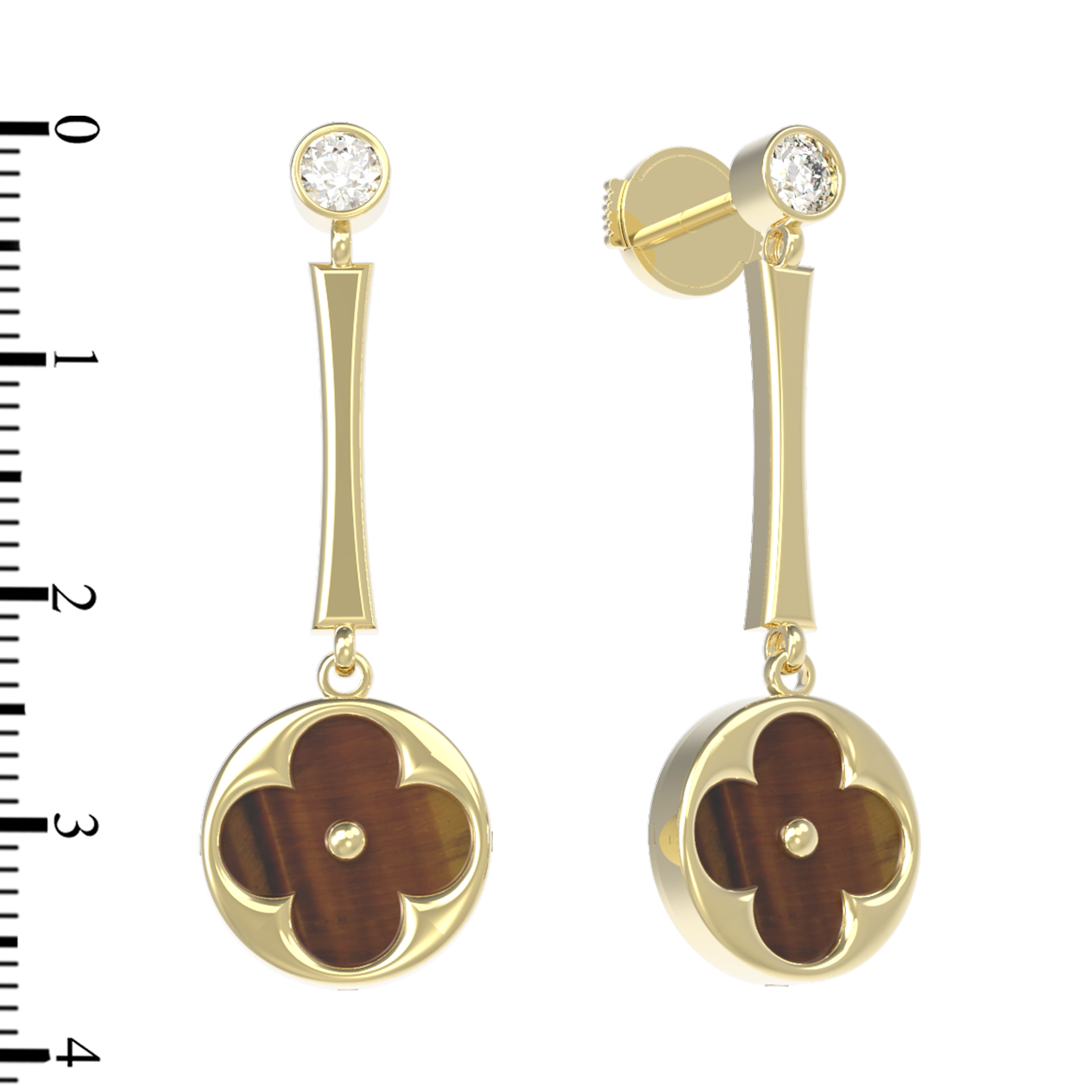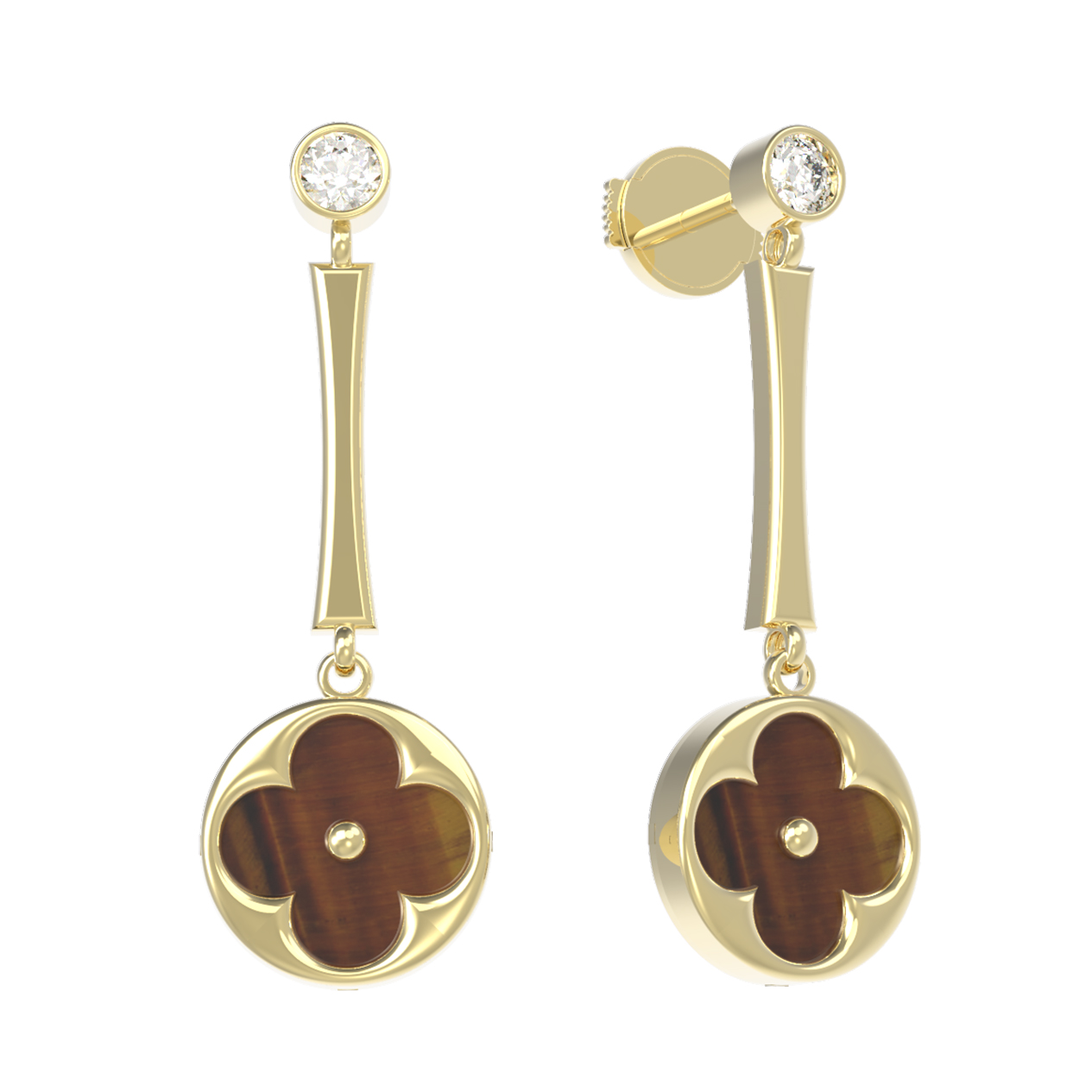 Центральным элементом композиции является изысканный дизайн Клевер. Внутренняя часть декоративного элемента выполнена из натурального тигрового глаза оранжевого цвета, который притягивает взгляд своими глубокими переливами. Контраст теплых оттенков камня и холодного блеска лимонного золота создает гармоничную эстетику. Дополнительное сияние серьгам придает вставка из четырех фианитов белого цвета круглой формы, которые деликатно отражают свет при каждом движении.
