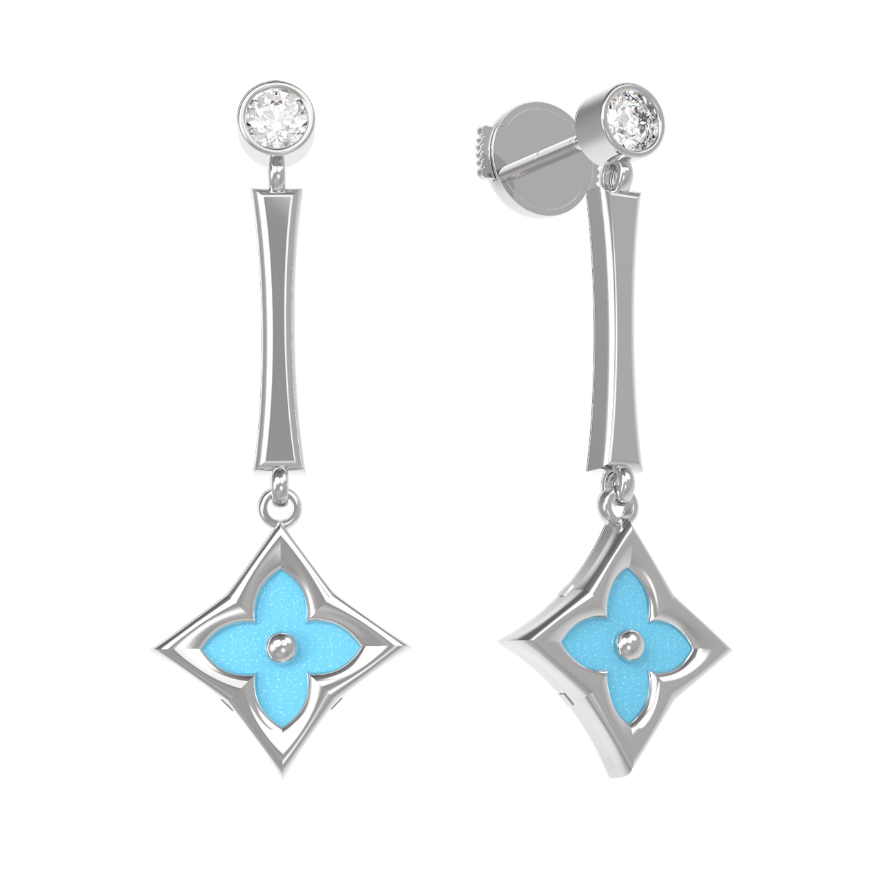 В центре композиции расположена яркая бирюза небесно-бирюзового цвета, чья природная красота дополнена сияющим прозрачным фианитом. Использование двух видов огранки и форм вставок — круглого фианита и ромбовидного элемента с бирюзой — придает серьгам динамику и глубину. Общее количество вставок составляет 4 штуки, что создает сбалансированный и гармоничный облик украшения.