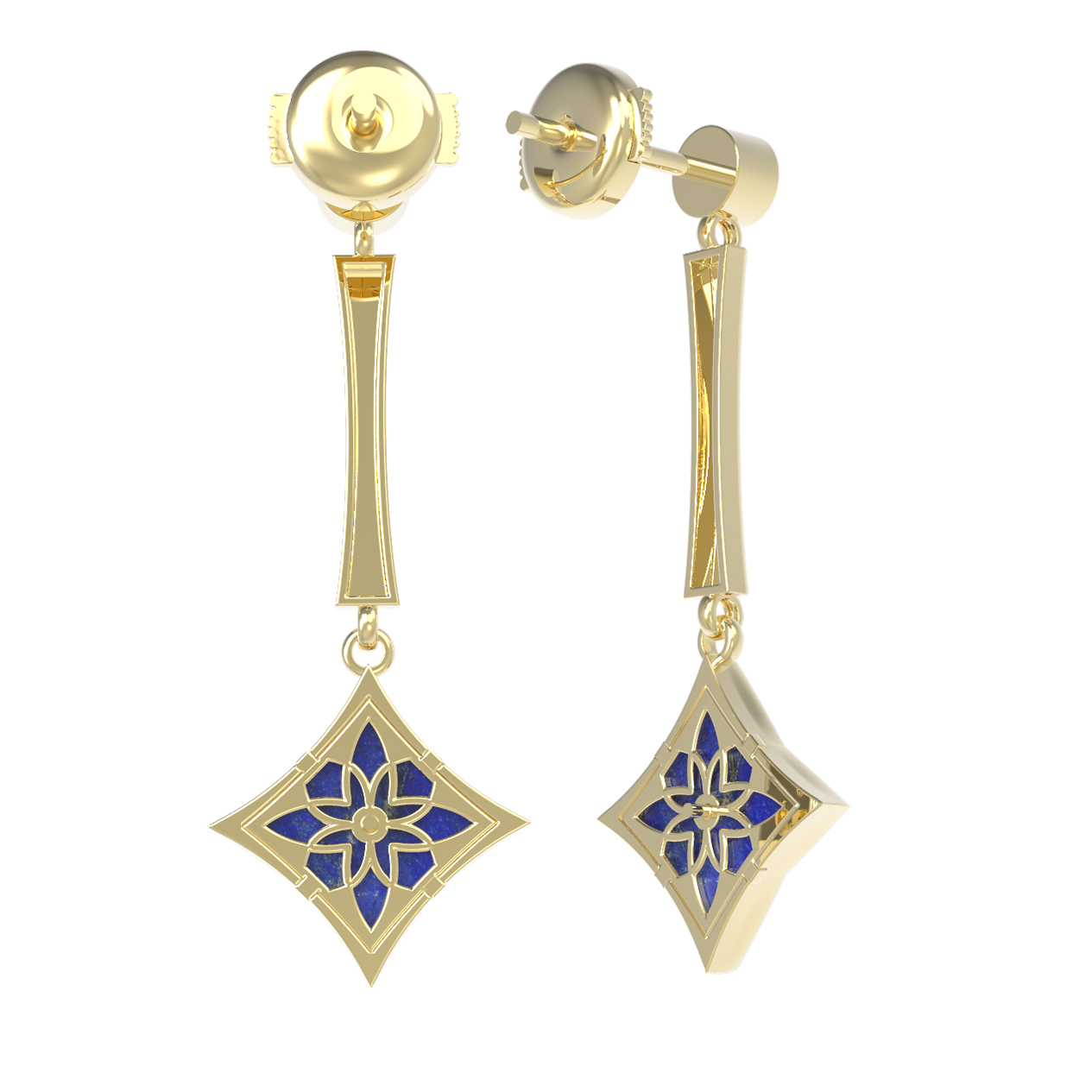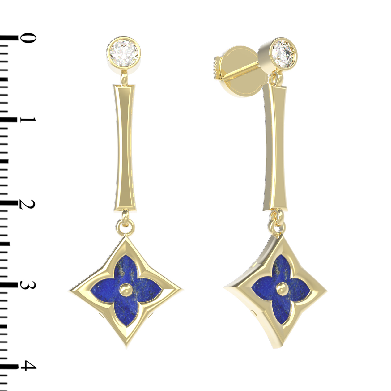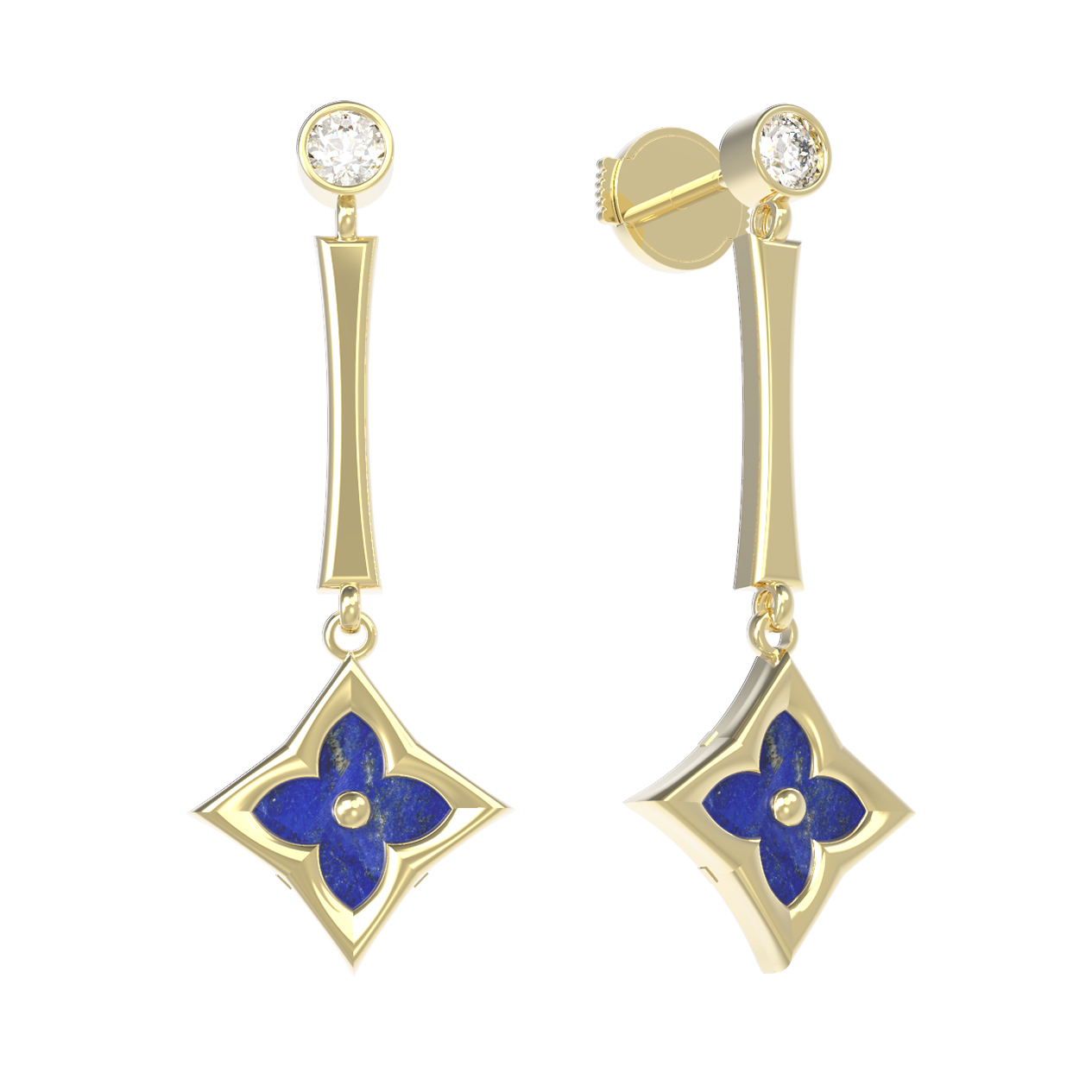 Основу дизайна составляет изящный мотив клевера, заключенный в геометричную форму ромба. Лаконичность линий подчеркивается контрастной игрой камней. В общей сложности модель украшают 4 вставки: круглые прозрачные фианиты белого цвета, создающие акцент у основания, и насыщенный синий лазурит, который наполняет образ глубиной и особой выразительностью.