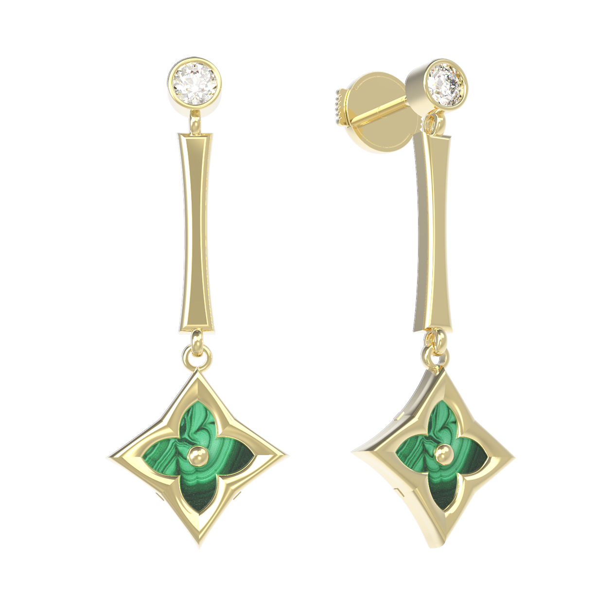 Элегантные и выразительные серьги из лимонного золота 585 пробы станут изысканным акцентом вашего образа. Дизайн украшения вдохновлен эстетикой флористических мотивов: в центре внимания находится узнаваемый символ клевера, выполненный с безупречной геометрической точностью. Ромбовидная форма подвесной части гармонично сочетается с насыщенным зеленым оттенком малахита, который добавляет изделию природной глубины и благородства.
