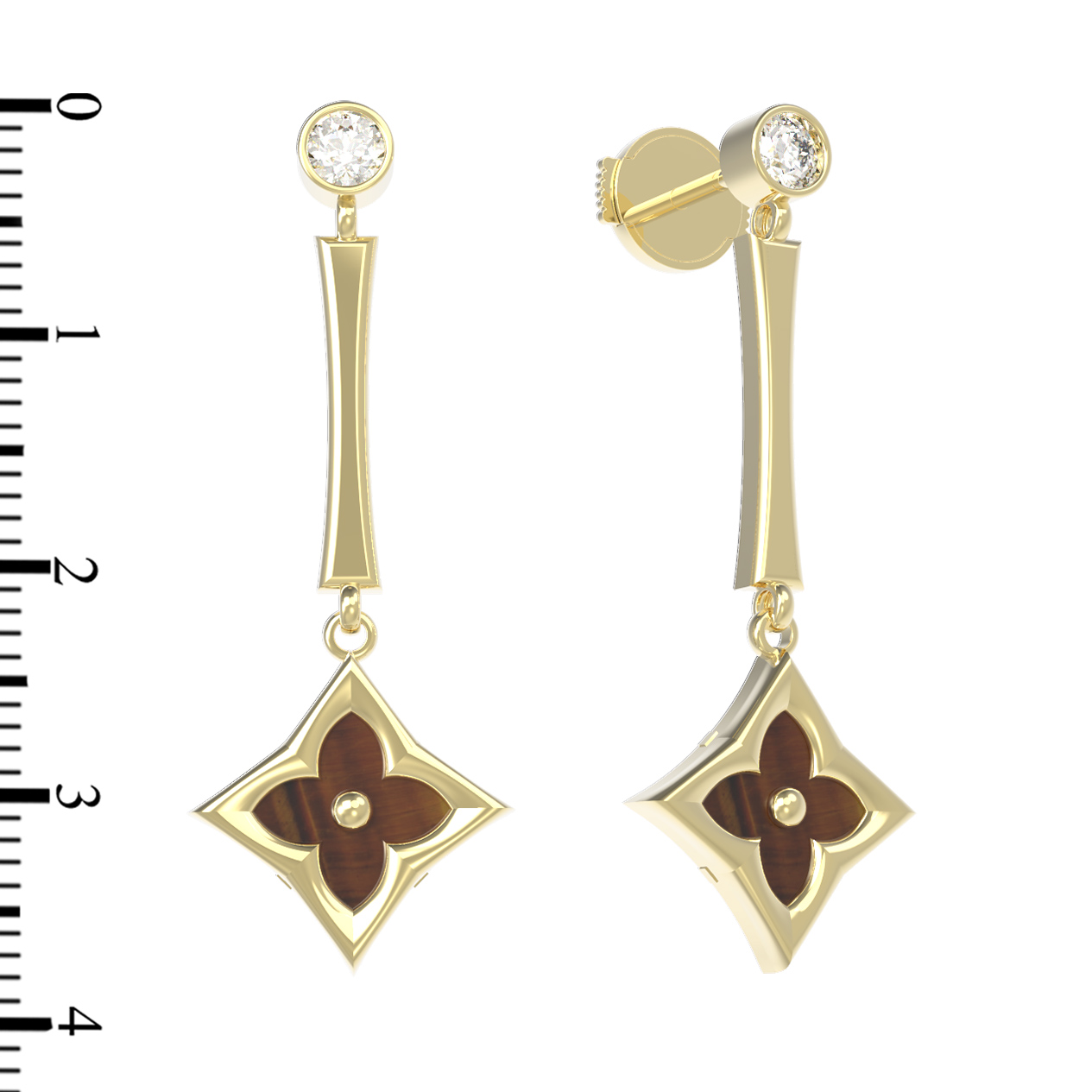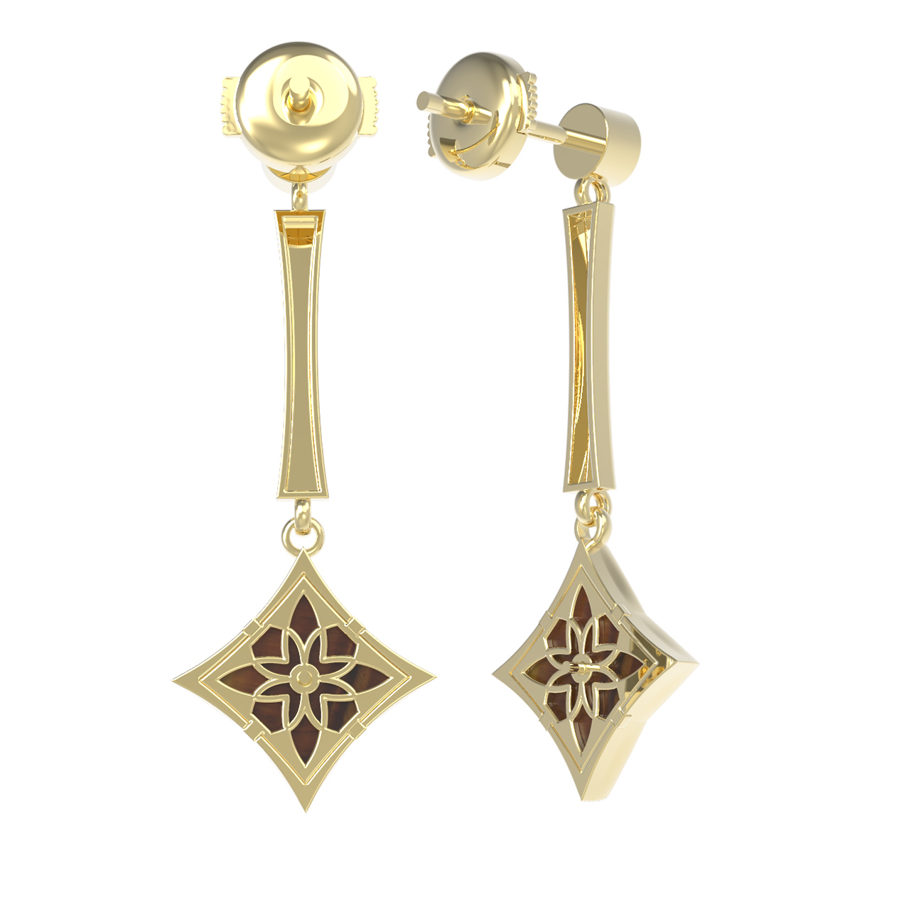 Центральным элементом композиции является вставка из натурального тигрового глаза оранжевого цвета, выполненная в форме ромба, которая притягивает взгляд своей природной глубиной. Акцентным дополнением служит сверкающий фианит круглой огранки белого цвета, расположенный в верхней части изделия. Всего серьги содержат 4 вставки, которые идеально сочетаются друг с другом, создавая завершенный ювелирный ансамбль.