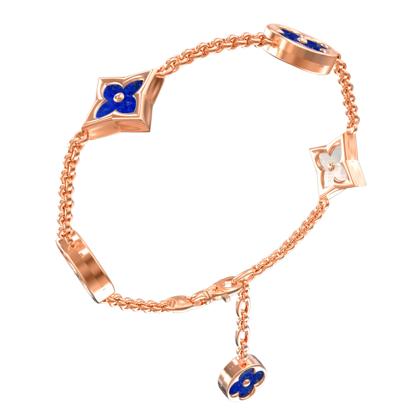В украшении искусно использованы 5 вставок, сочетающих в себе благородный синий лазурит и нежный перламутр. Контраст между глубоким цветом лазурита и мягким сиянием перламутра создает выразительную игру оттенков. Форма вставок круг и ромб добавляет браслету динамики и оригинальности. Это ювелирное изделие выполнено с вниманием к деталям и прекрасно подойдет как для женщин, так и для мужчин, которые ценят качественные аксессуары.