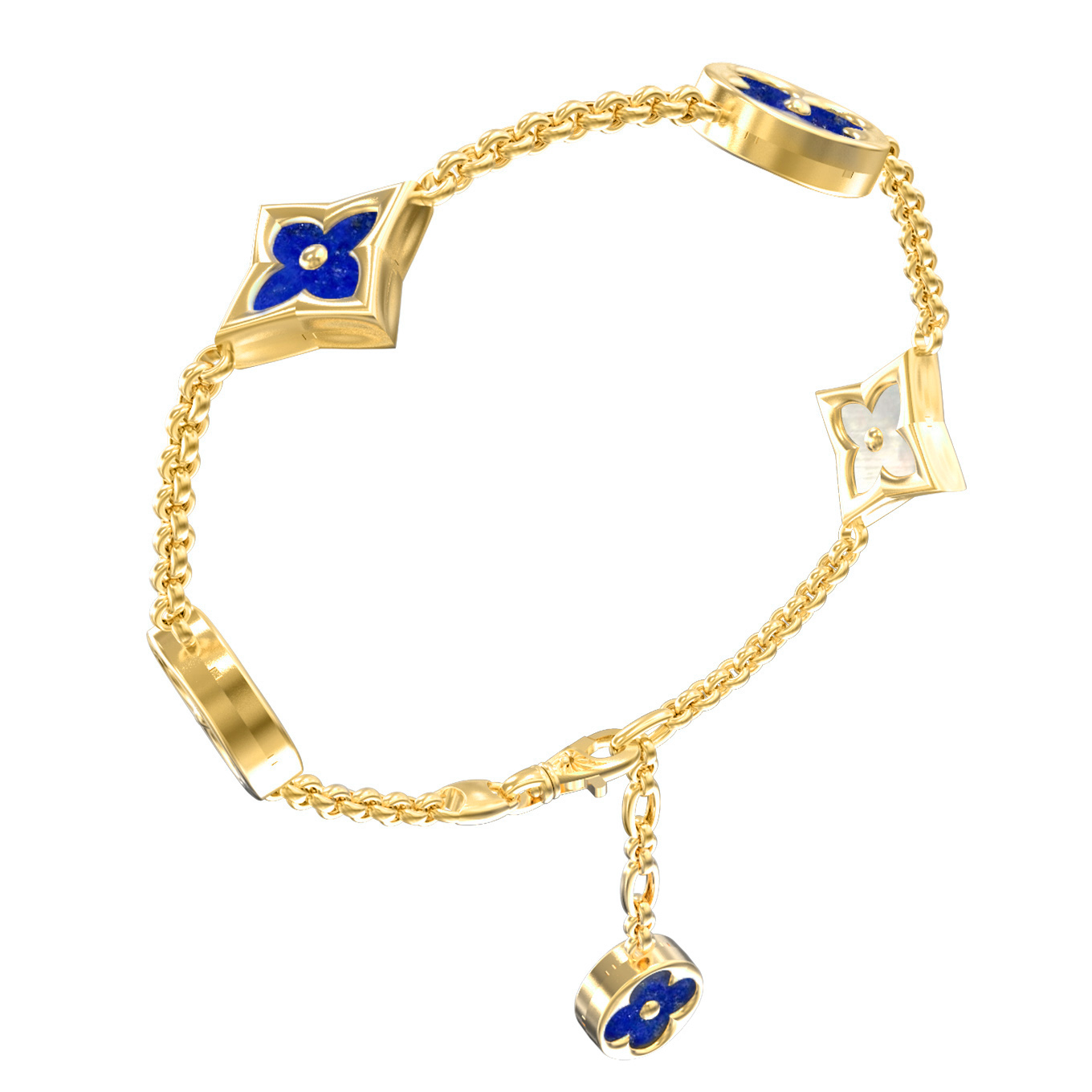 Центральными элементами композиции выступают пять вставок, выполненных в двух формах: круг и ромб. Контрастное сочетание глубокого синего лазурита и нежного перламутра создает неповторимую игру цвета, подчеркивающую статусность изделия. Такая цветовая гамма позволяет легко интегрировать браслет как в женский, так и в мужской гардероб, добавляя образу нотку роскоши и утонченности.