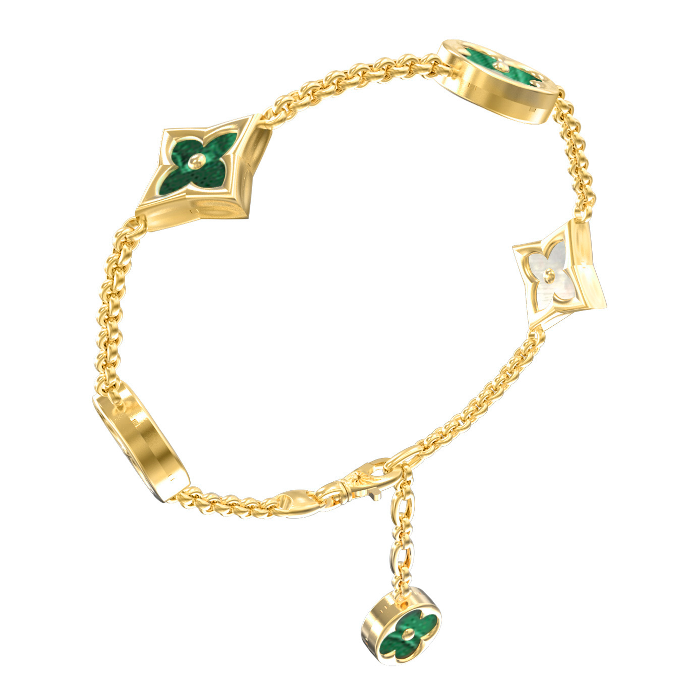 В дизайне использовано 5 вставок, в которых глубокий зеленый цвет малахита соседствует с нежным перламутром. Контрастное сочетание этих природных материалов подчеркивает благородный блеск лимонного золота. Тщательно проработанная деталь в виде подвесного элемента делает украшение более живым и интересным при каждом движении. Это ювелирное изделие станет безупречным дополнением как для женщин, так и для мужчин, предпочитающих подчеркивать свой статус и вкус.