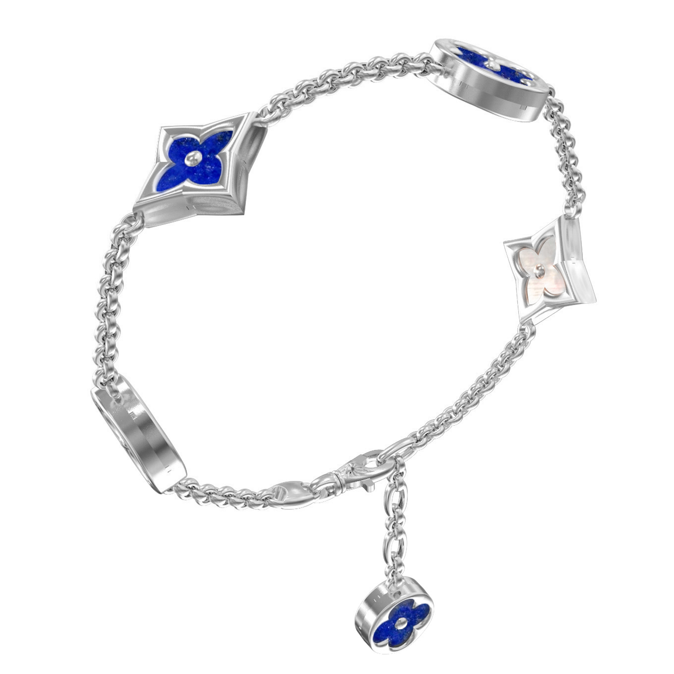 Центральными элементами композиции являются 5 вставок, выполненных в форме круга и ромба. Благородный синий цвет лазурита гармонично контрастирует с мягким перламутром, создавая неповторимую игру оттенков. Гладкая поверхность белого золота подчеркивает чистоту линий и глубину цвета натуральных камней, привлекая внимание к деталям исполнения.