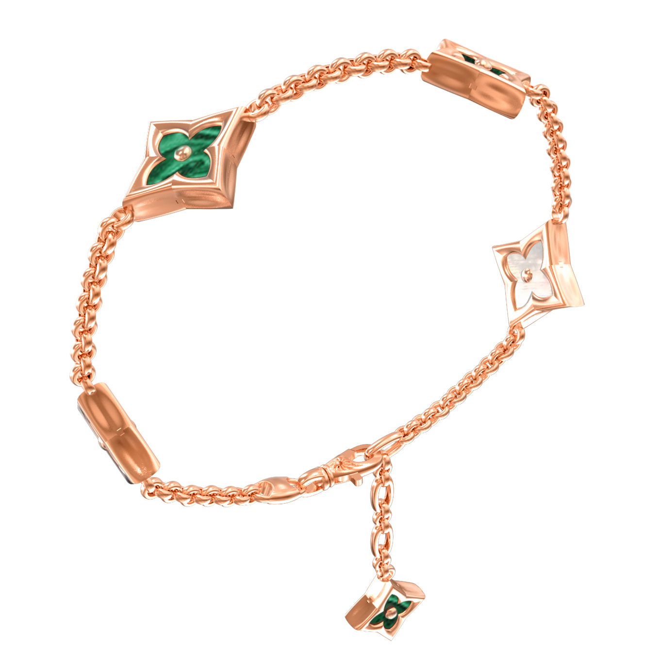 В дизайне гармонично объединены два типа вставок: глубокий зеленый малахит и нежный перламутр. Контраст между насыщенным природным оттенком камня и мягким сиянием перламутра создает неповторимую игру цвета, которая подчеркивает благородство красного золота. Тонкое плетение цепочки деликатно облегает запястье, делая украшение комфортным для повседневной носки.