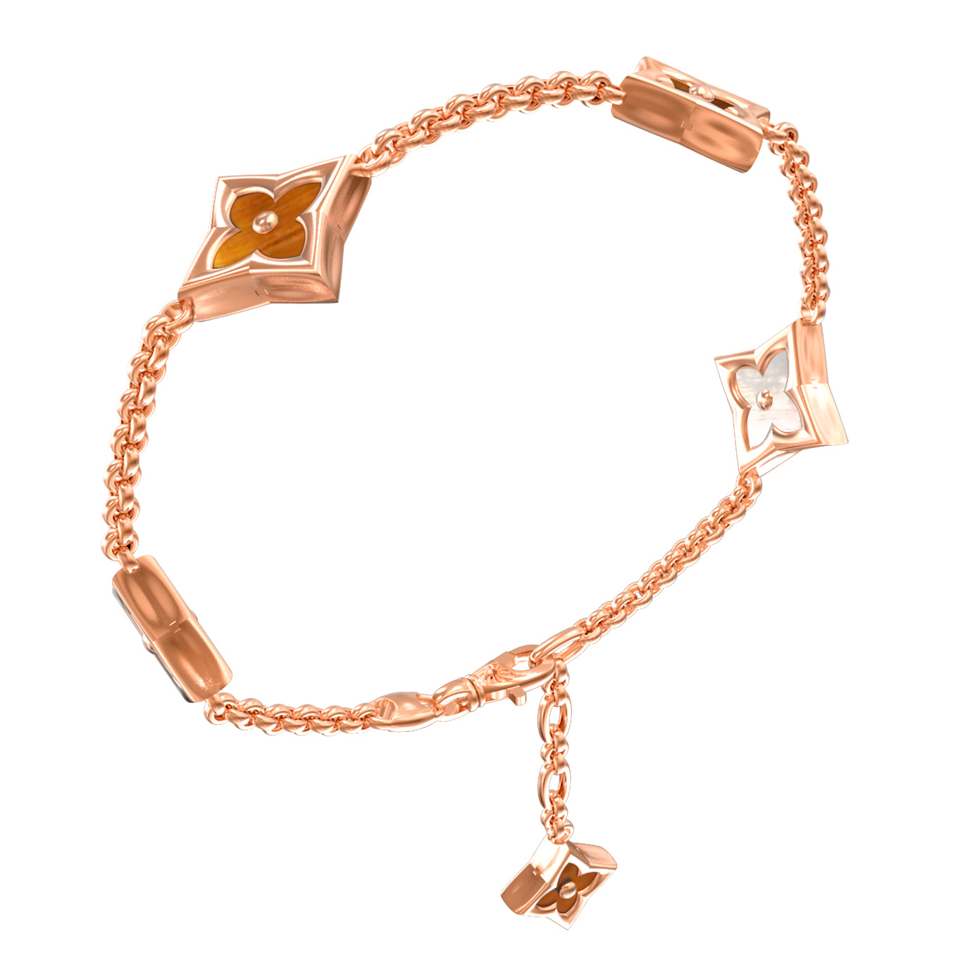 Центральным элементом композиции является изящный дизайн в форме клевера, который придает украшению особый шарм и символичность. В браслете использовано 5 вставок ромбовидной формы, которые эффектно перекликаются между собой. Глубокий, насыщенный оранжевый цвет тигрового глаза великолепно контрастирует с нежным, переливающимся перламутром. Мастера ювелирного дела объединили эти натуральные камни в одном изделии, создавая уникальную игру света и текстур. Данный браслет прекрасно смотрится как самостоятельное украшение, так и в сочетании с другими ювелирными изделиями, позволяя создавать полноценные комплекты.