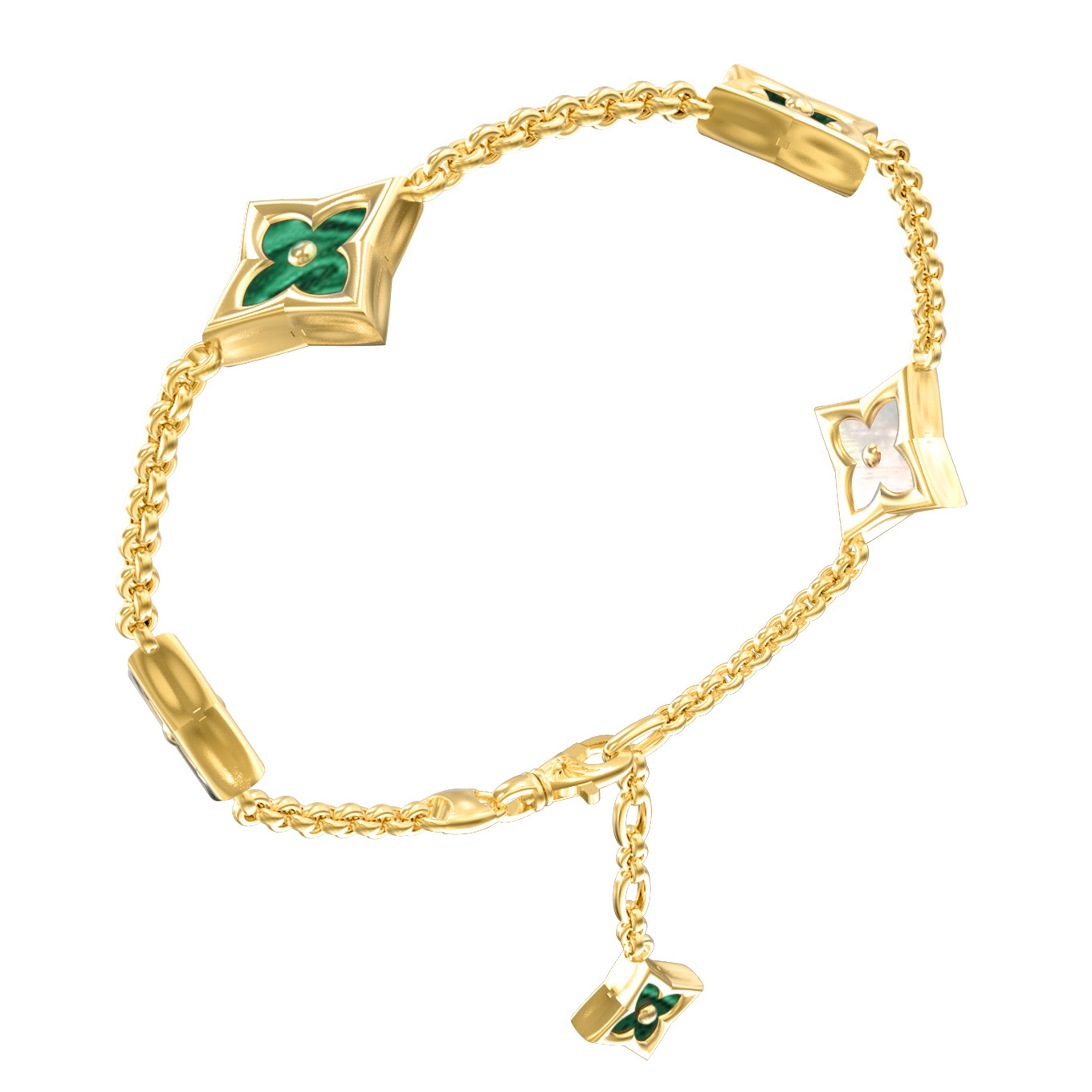 Элегантный браслет из коллекции De Luxe — Амальфи станет безупречным акцентом в вашем образе. Изделие выполнено из благородного лимонного золота 585 пробы, чей теплый солнечный оттенок идеально гармонирует с природной красотой вставок. Ювелиры выбрали для композиции глубокий зеленый малахит и нежный перламутр, которые создают завораживающий контраст. Пять декоративных элементов в форме ромбов с изящным дизайном в виде клевера равномерно распределены по цепочке, придавая украшению особую выразительность и утонченность.
