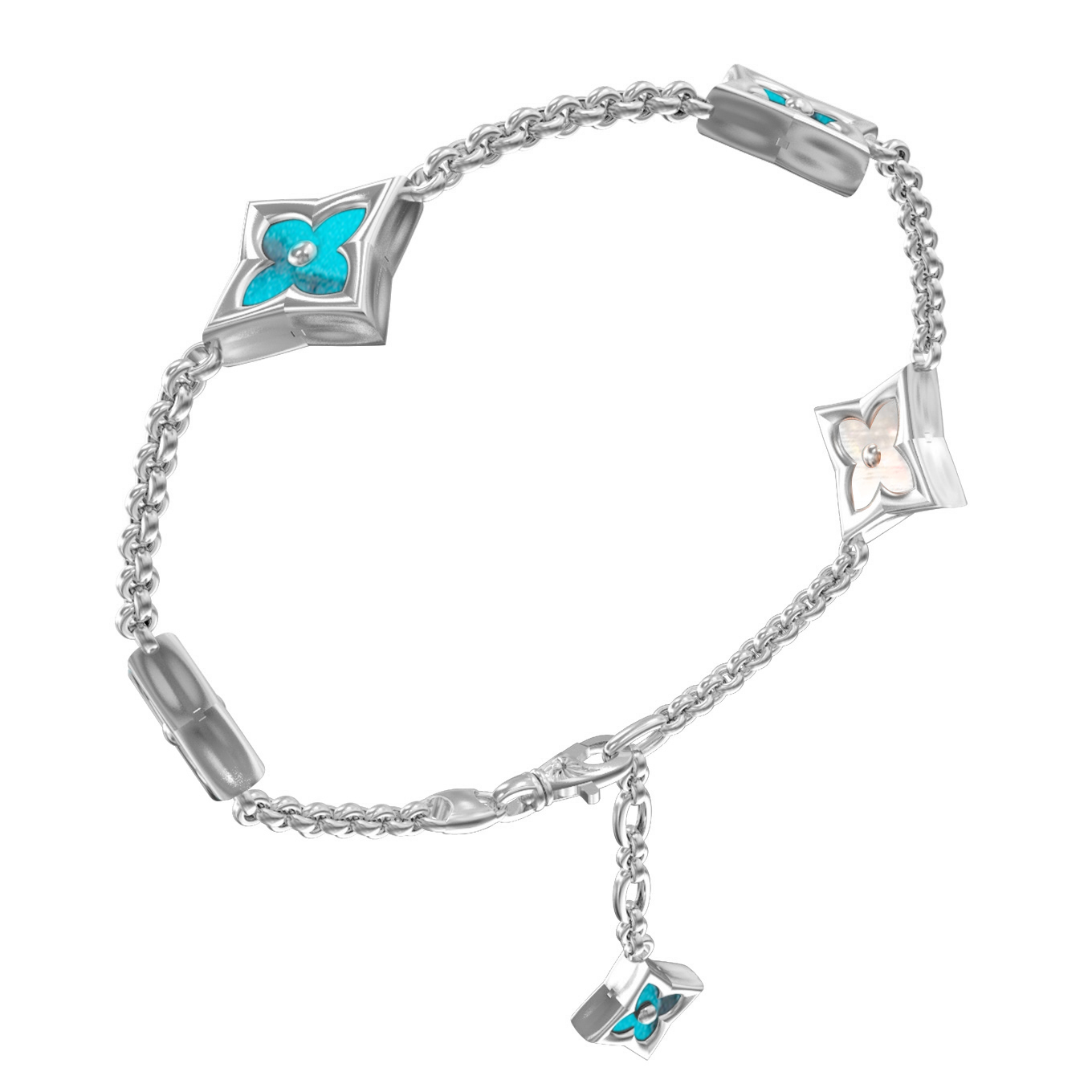 Центральным элементом композиции выступают пять вставок, выполненных в форме ромба. Гармоничное сочетание яркой бирюзы и нежного перламутра создает привлекательный контраст, который эффектно смотрится на фоне холодного блеска белого золота. Ювелиры тщательно подобрали материалы, чтобы каждый оттенок — бирюзовый и перламутровый — подчеркивал глубину и чистоту исполнения. Плетение цепи обеспечивает комфортную посадку на руке.