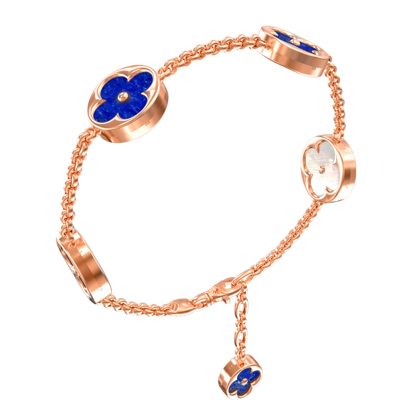 Особую привлекательность изделию придает сочетание двух контрастных вставок. На браслете расположены 5 вставок круглой формы: благородный синий лазурит и нежный, переливающийся перламутр. Сочетание глубокого цвета камней и сияния красного золота создает завораживающий визуальный эффект. Тщательно проработанные детали позволяют носить это украшение как самостоятельный элемент, так и в сочетании с другими аксессуарами, создавая полноценные комплекты.