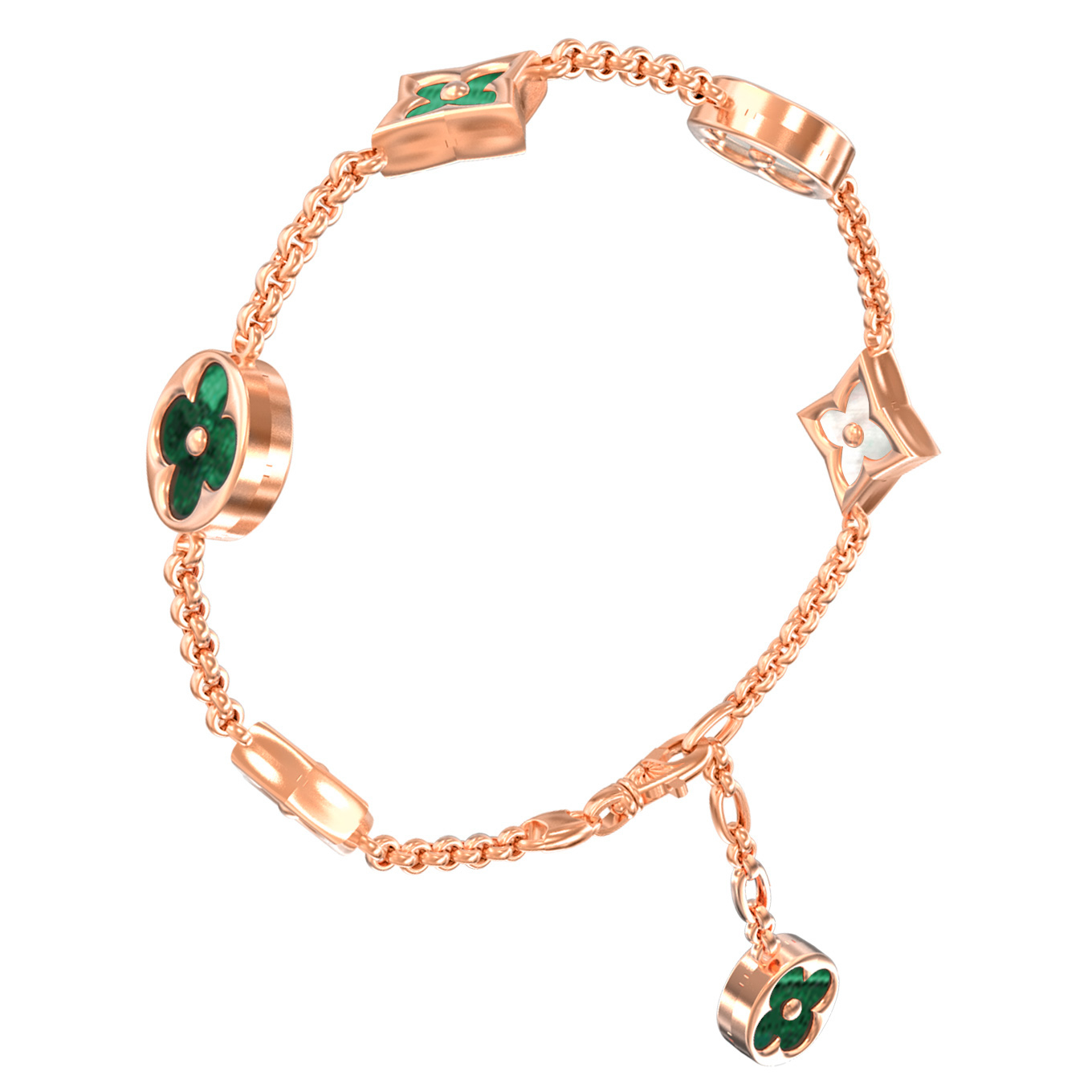 В центре композиции — 6 вставок, которые притягивают взгляд своей выразительностью. Глубокий зеленый оттенок малахита в сочетании с нежным перламутром создает эффектный контраст. Форма вставок разнообразна: круглые и ромбовидные элементы чередуются, создавая динамичный и продуманный облик браслета. Гладкие линии драгоценного металла подчеркивают игру света на поверхности натуральных камней.