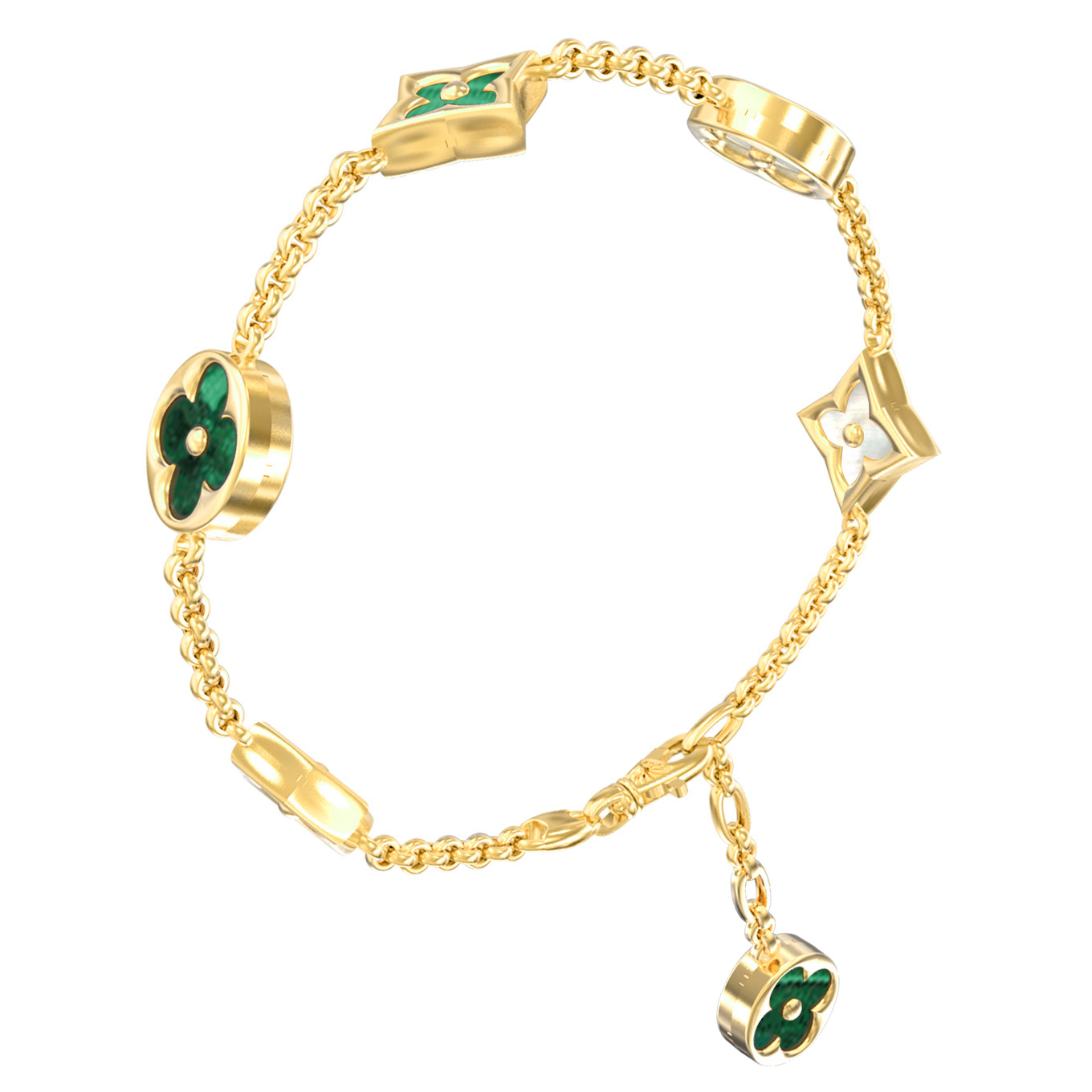Представляем вашему вниманию изысканный браслет из лимонного золота 585 пробы, вошедший в коллекцию De Luxe — Амальфи. Это украшение станет безупречным дополнением вашего образа, подчеркивая статус и тонкий вкус. Дизайн изделия, выполненный в популярной стилистике клевер, притягивает взгляды гармоничным сочетанием благородного металла и натуральных камней. Мастерски исполненная композиция включает 6 вставок, среди которых глубокий по цвету малахит насыщенного зеленого оттенка и нежный, переливающийся перламутр.