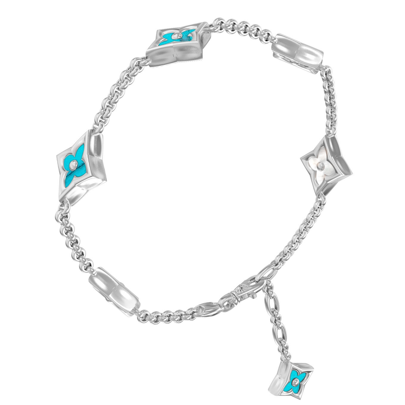 Дизайн украшения построен на узнаваемом мотиве клевера, который привносит нотки романтики и символизма в строгое ювелирное исполнение. Шесть вставок ромбовидной формы расположены по всей длине цепочки, создавая эффектный визуальный ритм. Бирюзовые и перламутровые оттенки вставок идеально дополняют друг друга, создавая контраст между матовой глубиной камня и мягким сиянием ракушки.