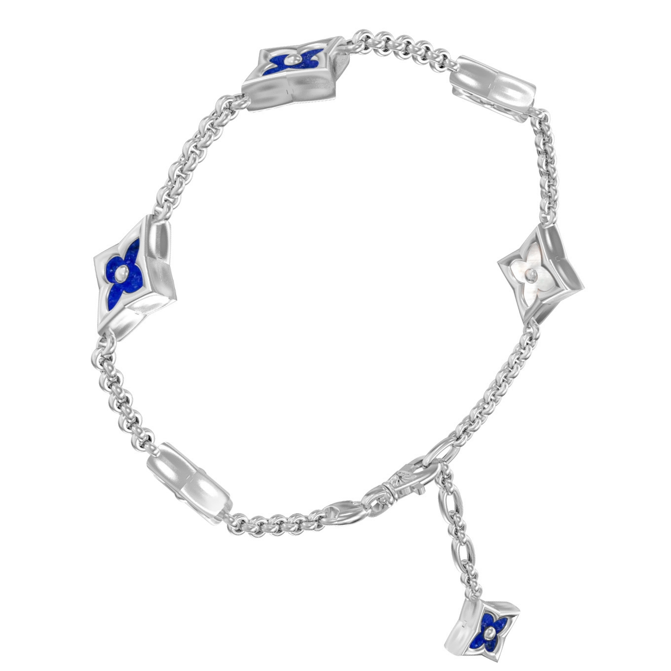 Ювелирное изделие декорировано 6 вставками, гармонично сочетающими глубокий синий лазурит и нежный перламутр. Такое контрастное сочетание вставок синего и перламутрового оттенков придает браслету особенную глубину и выразительность. Металл белого цвета подчеркивает холодное сияние камней, делая украшение статусным и элегантным дополнением к любому наряду.