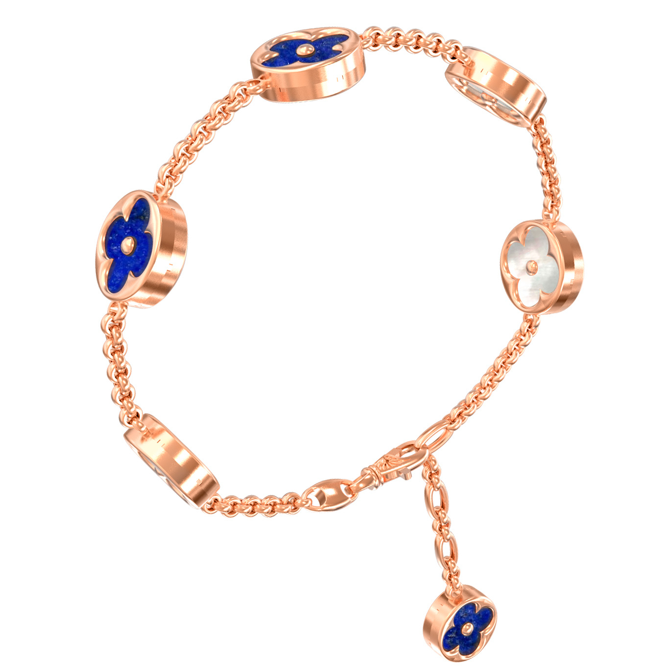 Центральным элементом дизайна выступает изящный мотив клевер. Шесть вставок круглой формы чередуются по всему периметру браслета, создавая динамичную и привлекательную композицию. Насыщенный синий цвет лазурита эффектно контрастирует с нежным перламутром, придавая украшению глубину и особую выразительность. Тщательная проработка деталей гарантирует комфорт при ежедневной носке.