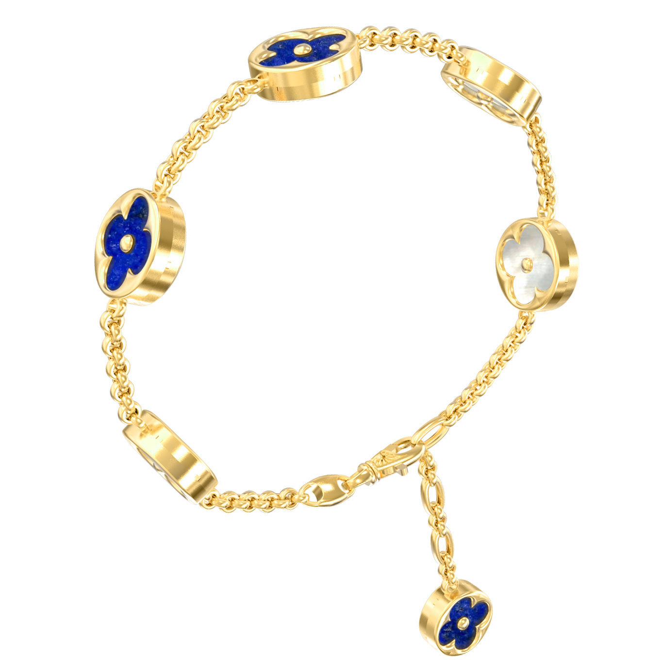 Для декора мастера выбрали сочетание глубокого синего лазурита и нежного перламутра. Насыщенный цвет вставок в сочетании с мягким блеском лимонного золота придает браслету статусность и делает его универсальным дополнением к любому образу. Надежный замок гарантирует комфортную посадку на запястье.