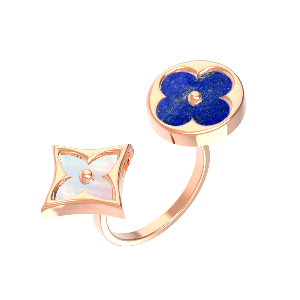 В центре внимания контрастное сочетание материалов. Насыщенный синий цвет лазурита в круглой форме соседствует с нежным перламутром, оформленным в виде ромба. Каждая вставка тщательно подобрана, чтобы создать гармоничный дуэт. Уникальная разомкнутая конструкция кольца делает его не только стильным аксессуаром, но и универсальным украшением, подходящим как для женщин, так и для мужчин.