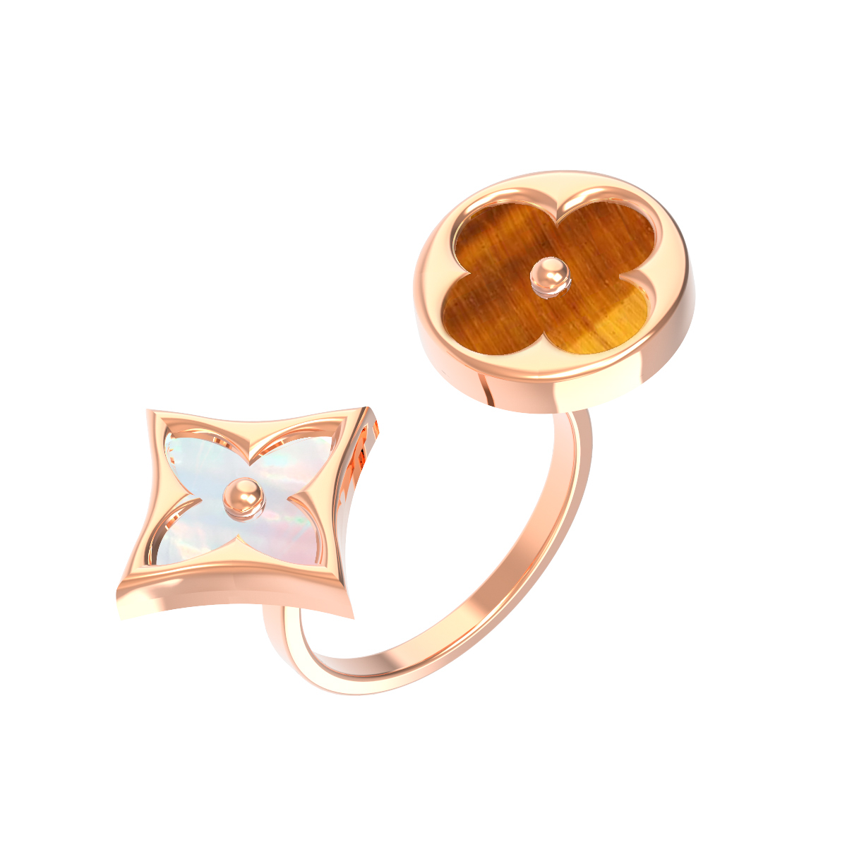 Оригинальное кольцо из красного золота 585 пробы станет ярким акцентом в вашем ювелирном гардеробе. Украшение из коллекции De Luxe — Амальфи выполнено в изысканном дизайне в форме клевера, который придает образу нотки утонченности и символичности. Контрастное сочетание драгоценных материалов делает аксессуар по-настоящему особенным: одна часть изделия украшена натуральным тигровым глазом оранжевого оттенка в форме круга, а вторая — нежным перламутром в форме ромба. Лаконичная центральная вставка завершает композицию, подчеркивая мастерство исполнения.
