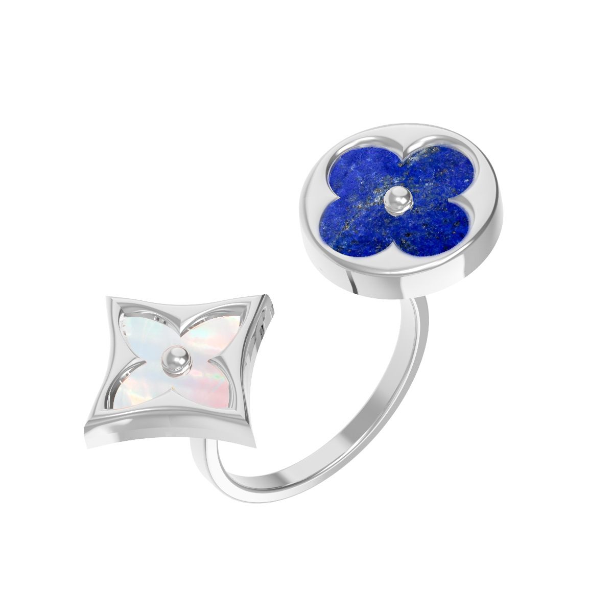 Особую выразительность кольцу придают две эффектные вставки: насыщенный синий лазурит в круглой оправе и нежный перламутр в форме ромба. Игра фактур и контраст оттенков делают аксессуар универсальным: он одинаково хорошо дополнит как строгий деловой костюм, так и вечерний наряд. Это украшение создано как для женщин, так и для мужчин, которые ценят лаконичную роскошь и оригинальные формы.