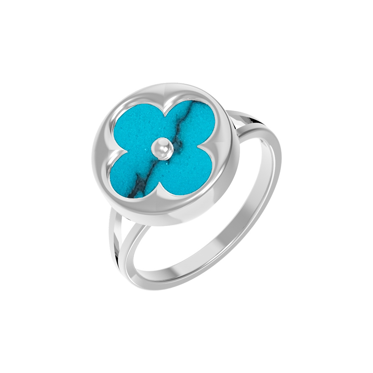 Элегантное кольцо из белого золота 585 пробы станет утонченным дополнением вашего образа, подчеркивая индивидуальность и безупречный вкус. Ювелирное изделие из коллекции De Luxe — Амальфи привлекает внимание своим лаконичным и вместе с тем оригинальным дизайном в форме клевера. Центральным акцентом украшения является единственная вставка из натуральной бирюзы яркого бирюзового цвета, чья круглая форма идеально гармонирует с мягким блеском белого металла.