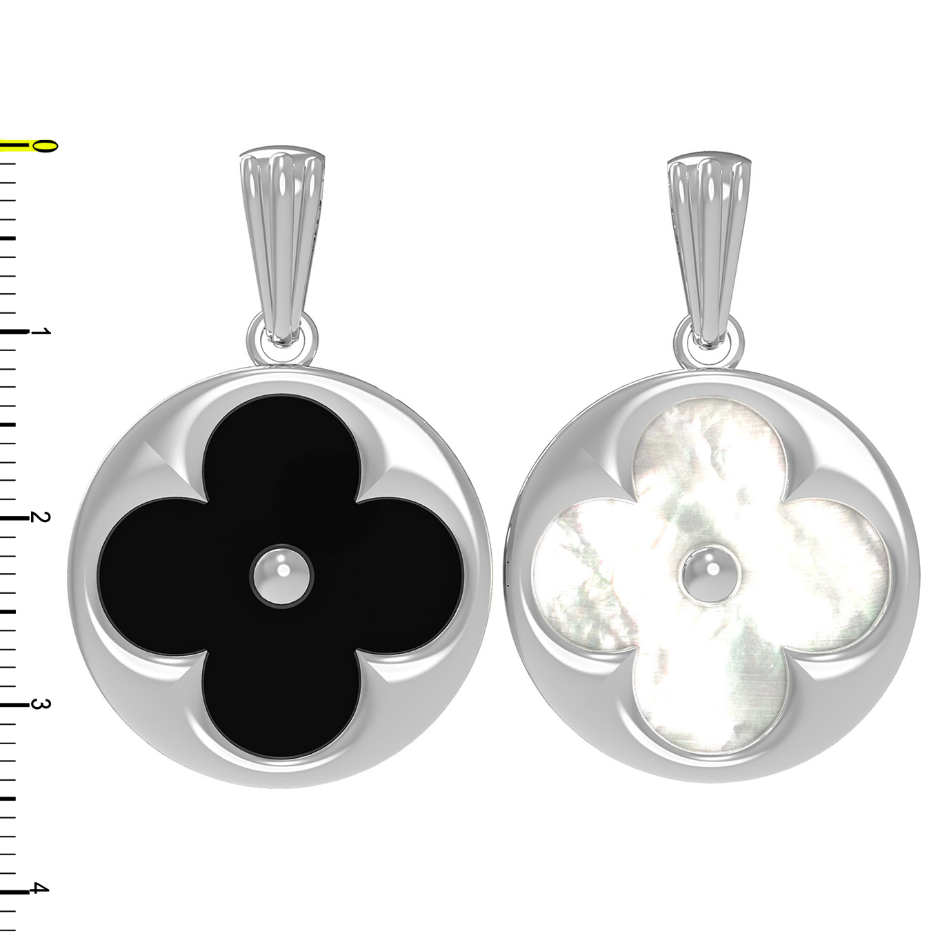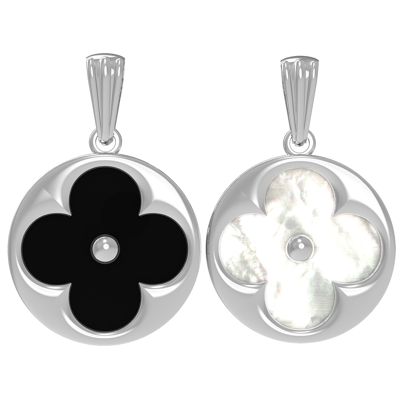 Центральный элемент композиции выполнен в форме круга, внутри которого расположен контрастный дизайн — клевер. Модель декорирована вставками из оникса и перламутра, создающими эффектный дуэт черного и белого цветов. Одна вставка круглой формы мастерски интегрирована в изделие, подчеркивая филигранную работу ювелиров.