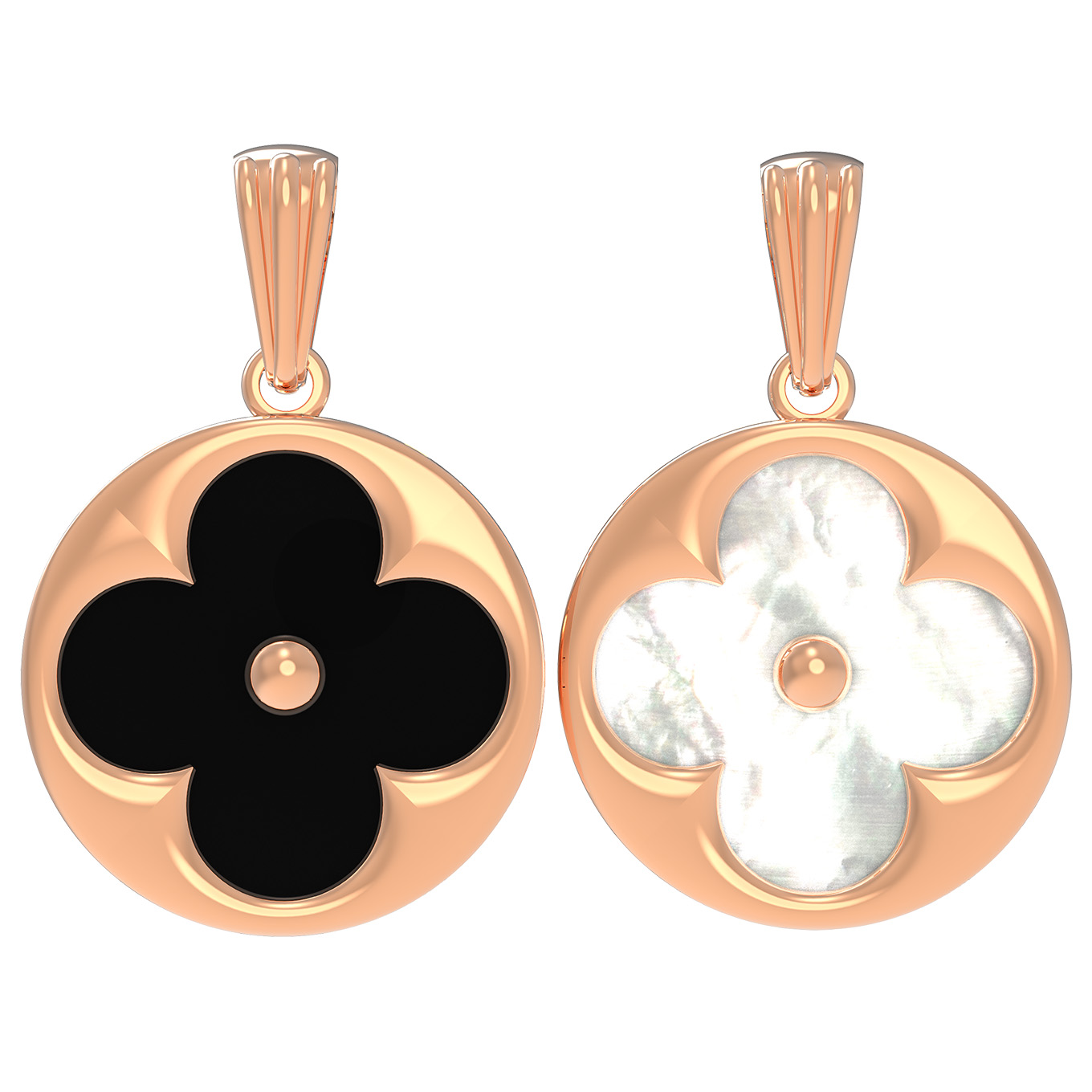 Особую выразительность подвеске придает контрастное сочетание вставок: глубокого черного оникса и нежного перламутра. Форма вставок круг подчеркивает геометрию изделия, создавая визуальный баланс. В дизайне предусмотрена одна вставка, которая гармонично вписана в золотую основу. Теплый оттенок красного золота превосходно сочетается как с таинственным черным цветом оникса, так и с сияющим перламутром, переливающимся природными оттенками.