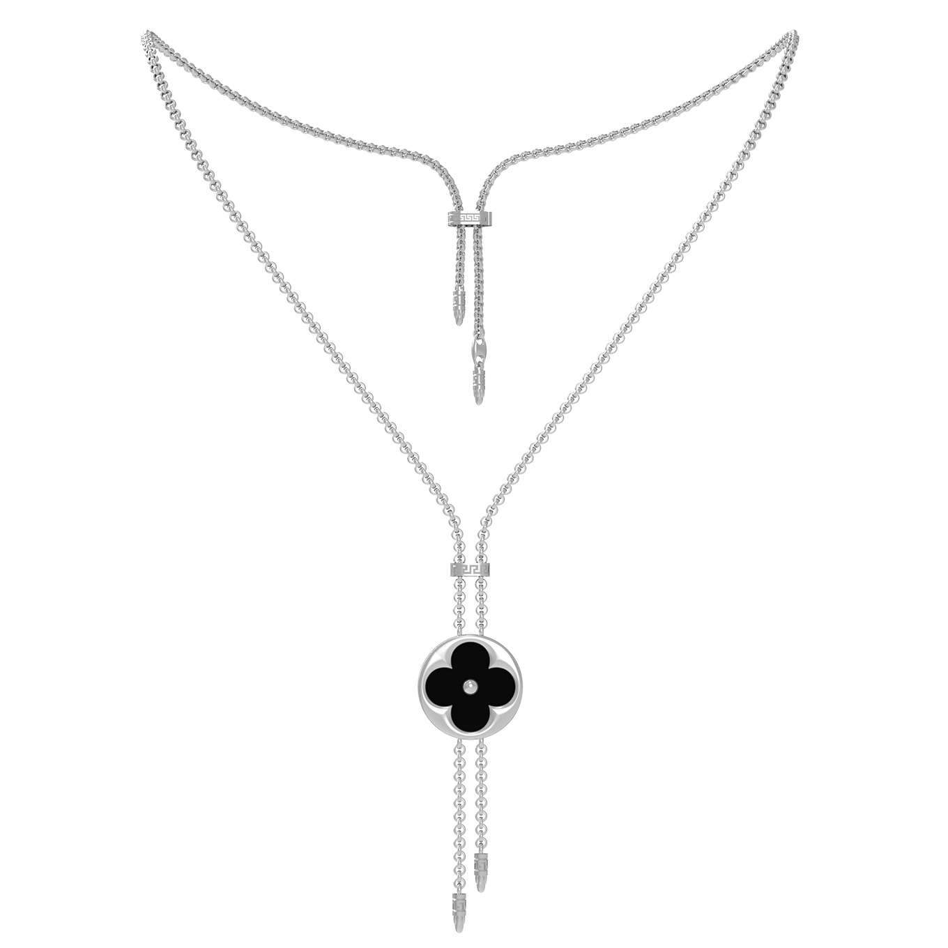 Элегантное колье из белого золота 585 пробы — это воплощение утонченного стиля и внимания к деталям. Изделие из коллекции De Luxe — Амальфи притягивает взгляд своей лаконичностью и глубоким контрастом. Центральным элементом украшения выступает изящный дизайн в форме клевера, символизирующий удачу и благополучие. Мастерское сочетание материалов создает гармоничный дуэт: насыщенный черный оникс и нежный перламутр объединены в одной круглой вставке, которая эффектно выделяется на фоне холодного блеска благородного белого металла.