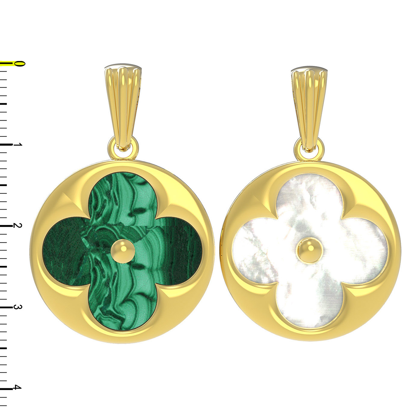 Элегантная подвеска из лимонного золота 585 пробы из серии De Luxe — Амальфи станет стильным акцентом вашего образа. Это ювелирное изделие, выполненное в узнаваемом дизайне клевер, сочетает в себе природную красоту камней и благородный блеск драгоценного металла. Особенностью украшения является вставка, которая гармонично объединяет малахит насыщенного зелёного цвета и нежный перламутр, создавая уникальный контраст оттенков и текстур.