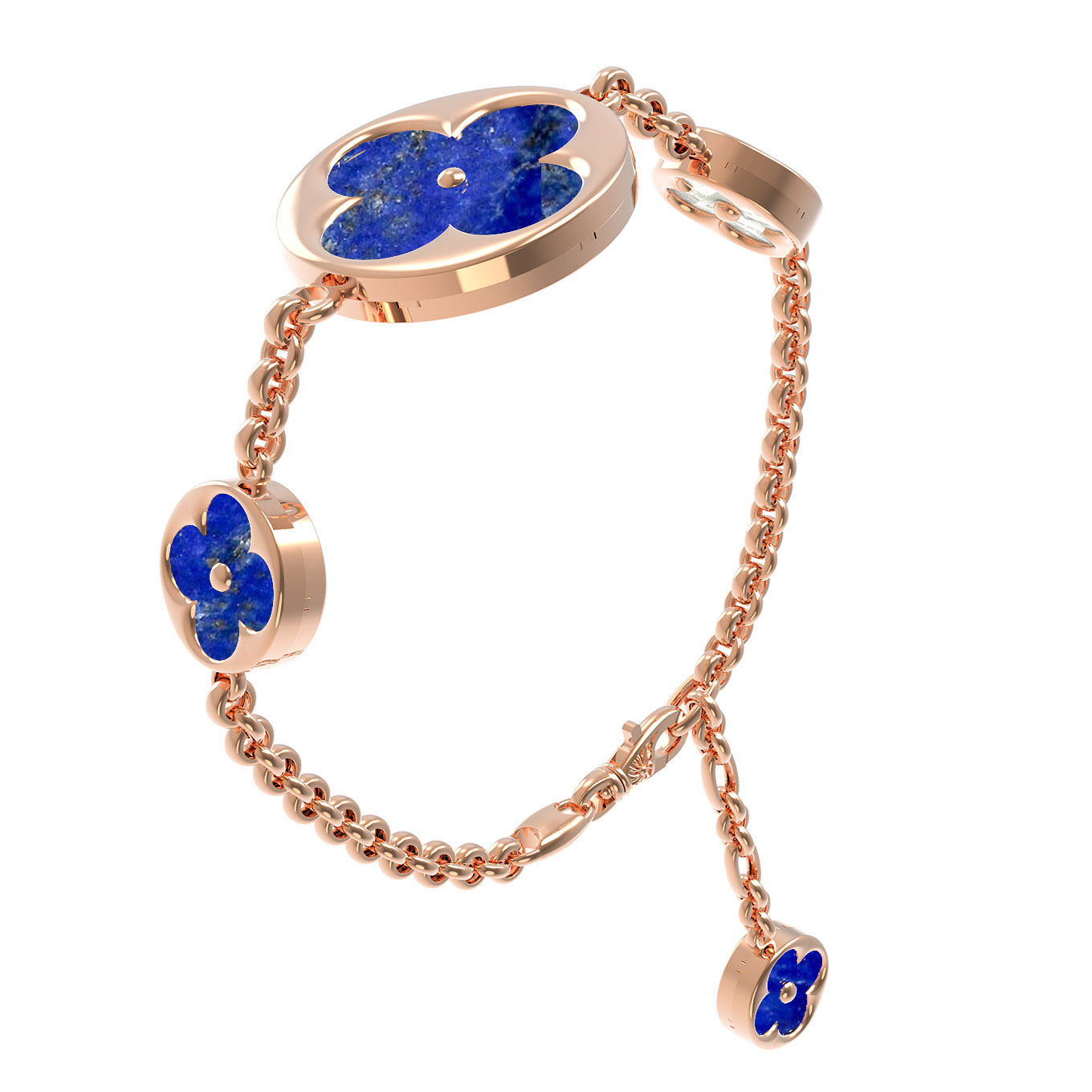 В центре внимания композиции находятся 4 вставки круглой формы: насыщенный синий лазурит и нежный перламутр создают выразительный дуэт, притягивающий взгляды. Игра глубоких оттенков синего и мягкого сияния перламутра делает этот браслет по-настоящему особенным. Качественная цепочка из красного золота гармонично дополняет декоративные элементы, обеспечивая комфортную посадку на запястье.