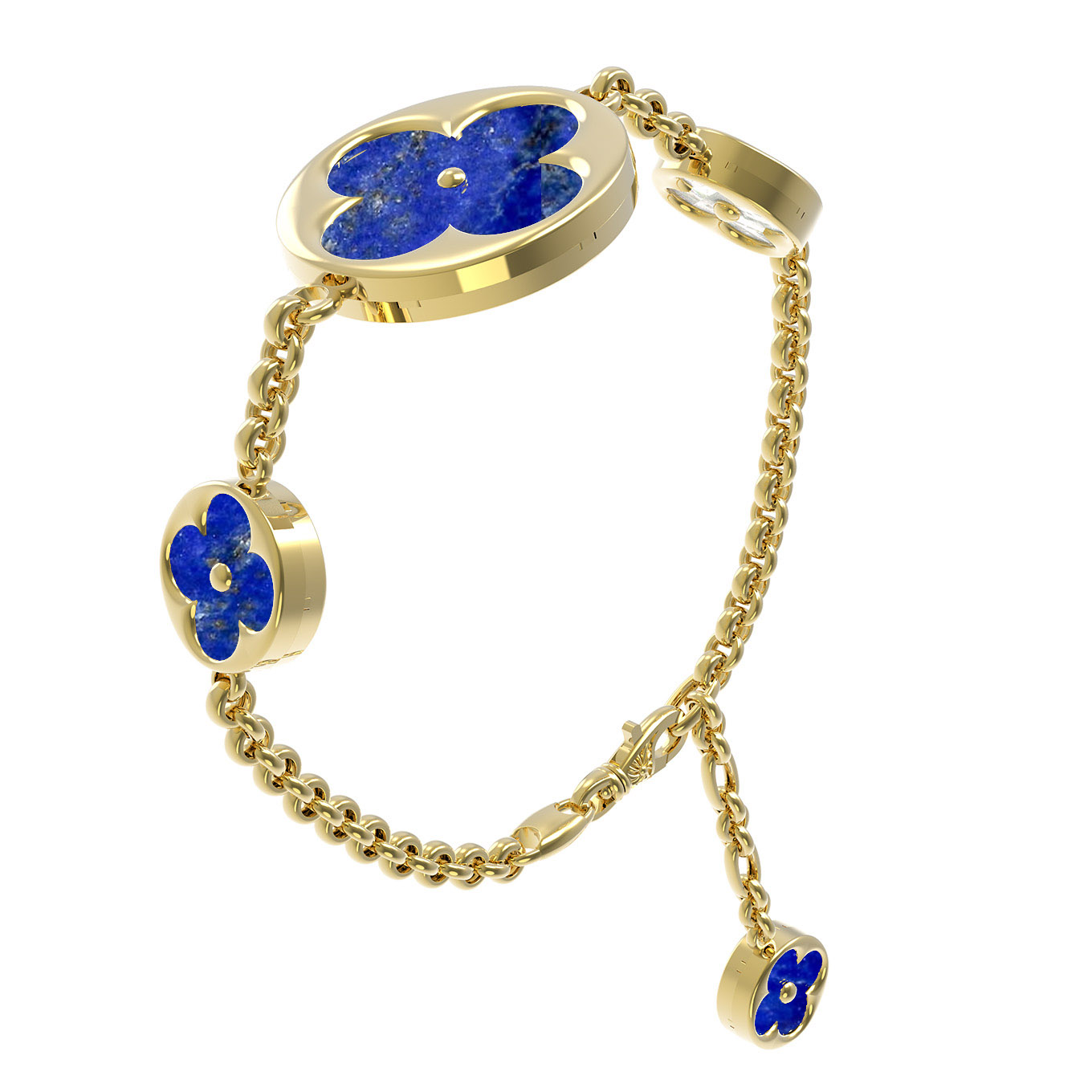 В дизайне модели гармонично сочетаются 4 вставки круглой формы: глубокий, насыщенный синий лазурит и нежный перламутр создают изысканный контраст. Лимонное золото подчеркивает яркость вставок, делая браслет заметным и стильным аксессуаром. Благодаря универсальной эстетике, это украшение одинаково эффектно смотрится как на женской, так и на мужской руке, подчеркивая индивидуальность владельца.