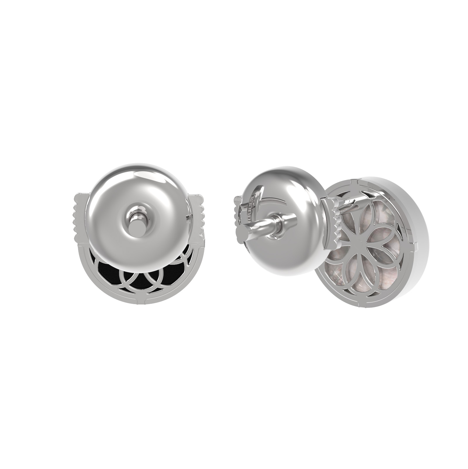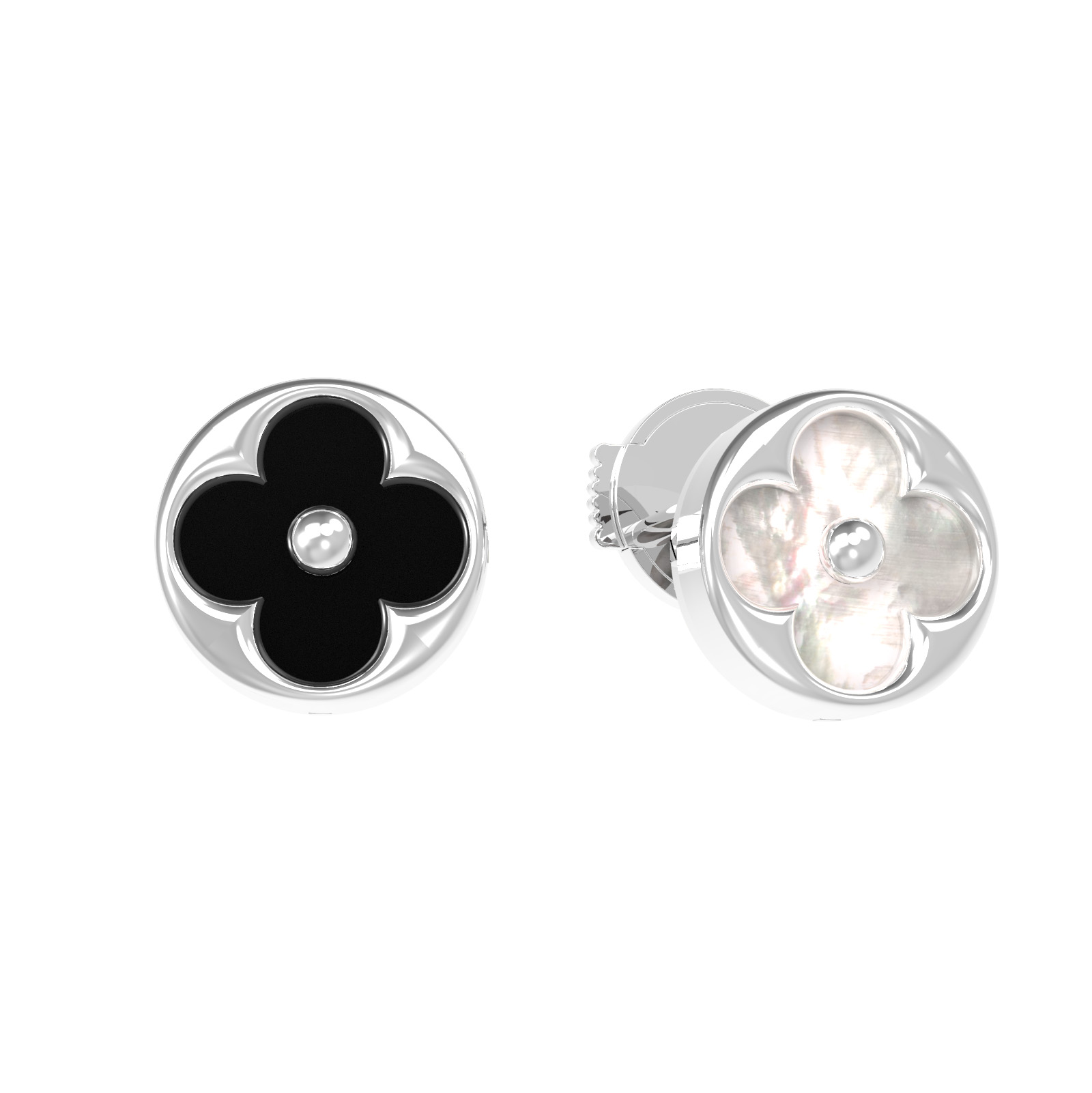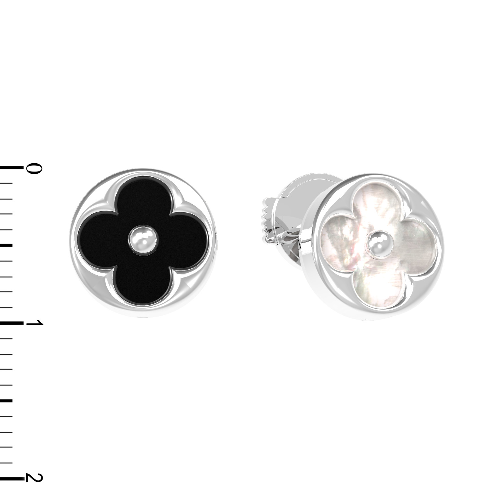 Особенностью модели является игра контрастов: в одной серьге используется глубокий черный оникс, а в другой — нежный переливчатый перламутр. Круглая форма вставок гармонично сочетается с мягкими очертаниями клевера, создавая сбалансированную и притягательную композицию. Каждое изделие содержит по 1 вставке, которые эффектно смотрятся в оправе из белого металла.